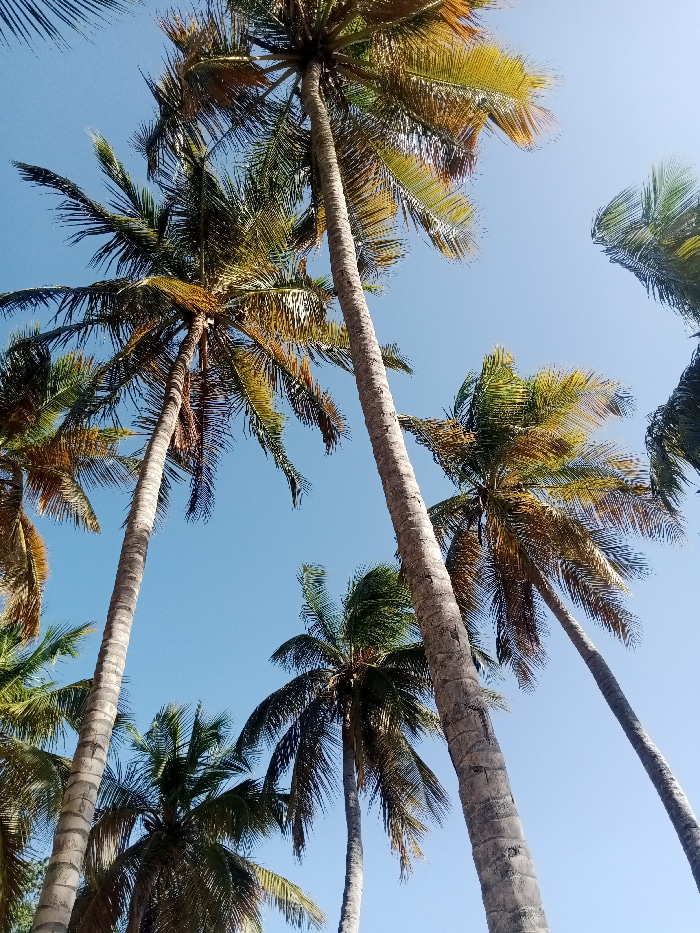 The image captures a vibrant, upward-looking perspective into a canopy of numerous palm trees against a clear, bright blue sky. The view is from directly below the trees, emphasizing their height and…read more