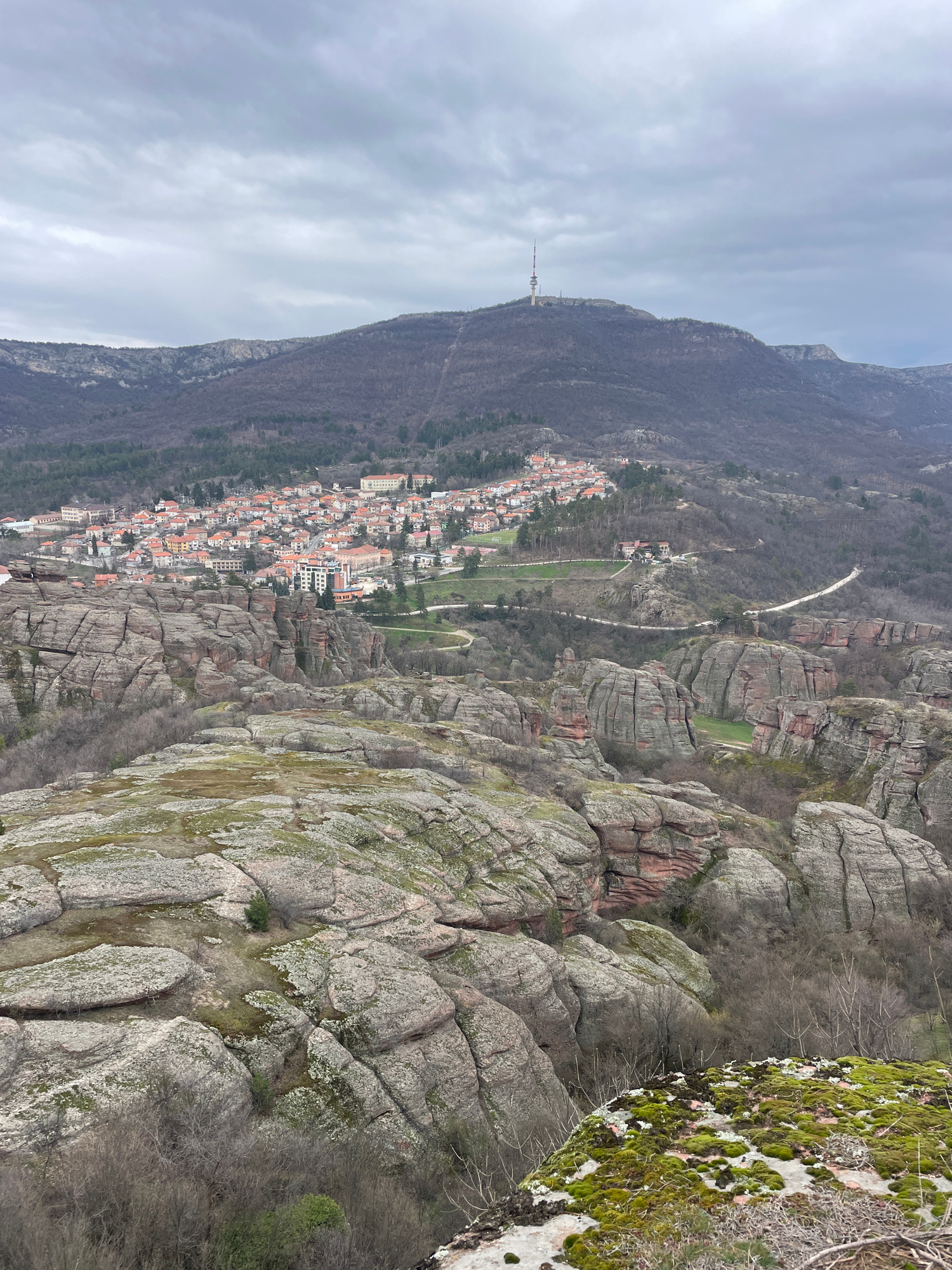 A downward-angled, medium-distance shot reveals a town situated at the base of a mountain, nestled among an expanse of large rock formations. The rocks are predominantly gray with patches of mossy gre…read more