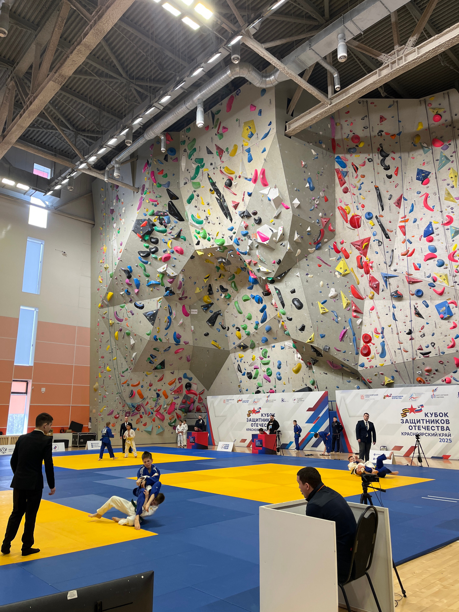 The image depicts an indoor sports facility, possibly a gymnasium or arena, in Krasnoyarsk, Russia. In the background is a climbing wall with a variety of colorful climbing holds affixed to a multi-fa…read more