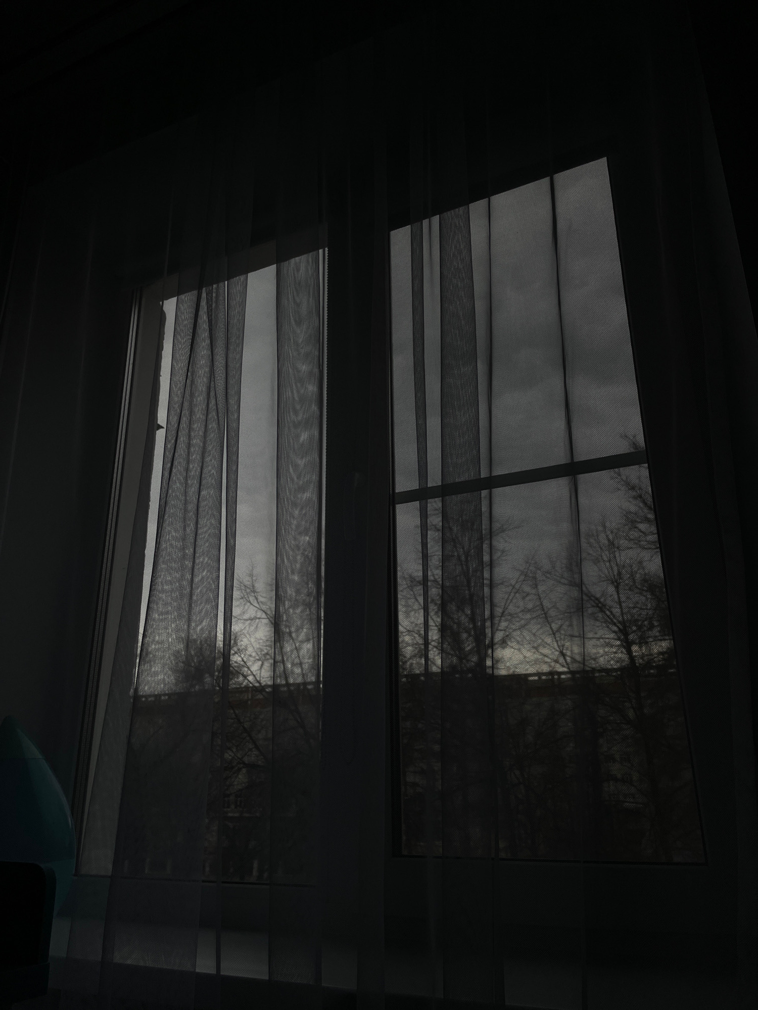 Two skylights with sheer blinds are visible, offering a glimpse of the outside. The trees outside suggest a natural environment, possibly a park or wooded area in Chaikovsky, Russia. Light levels are…read more