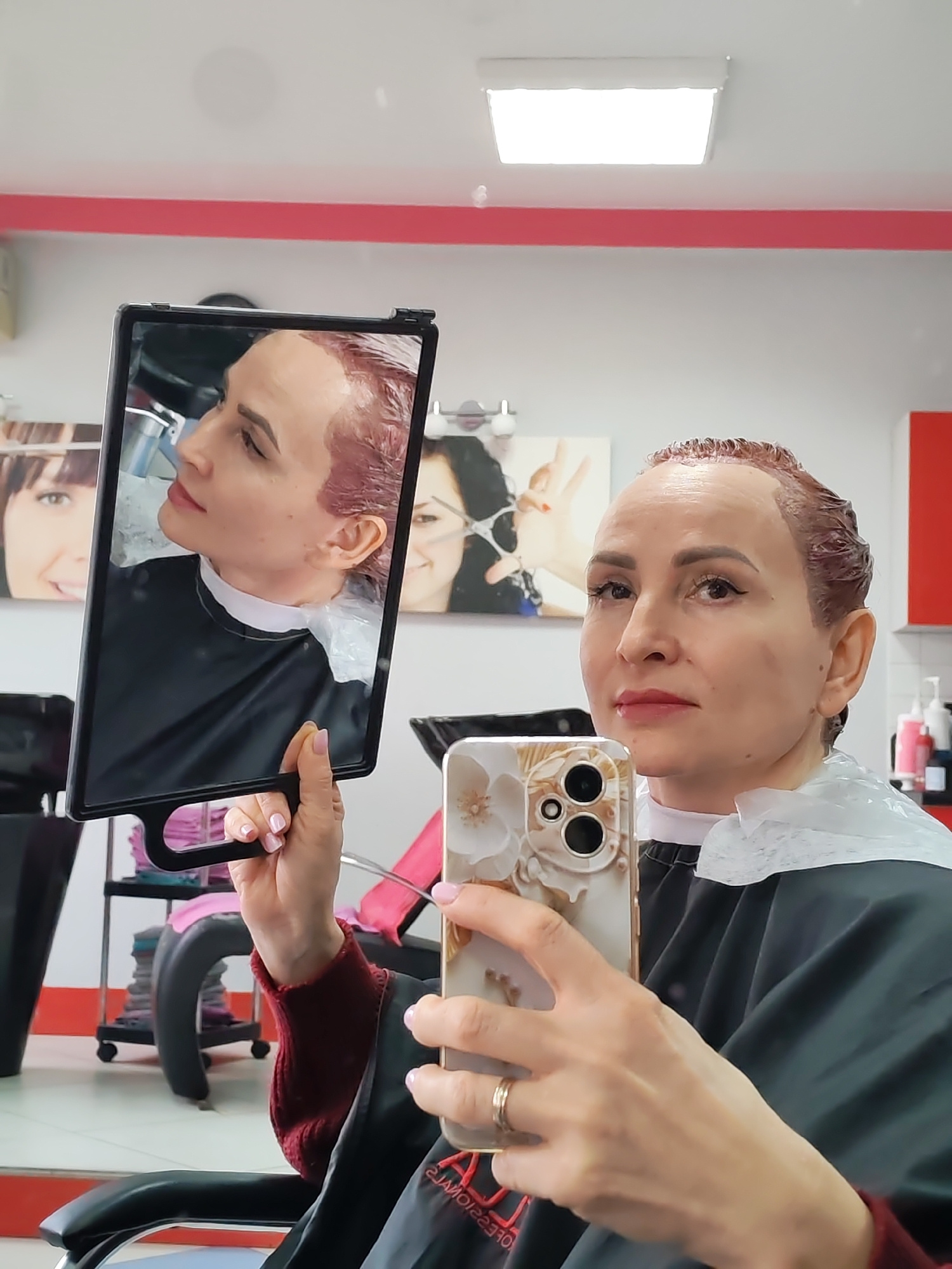 The image depicts a woman taking a selfie in what appears to be a hair salon. The woman has reddish-brown hair that seems to be undergoing a coloring process. She is wearing a black cape over a maroon…read more