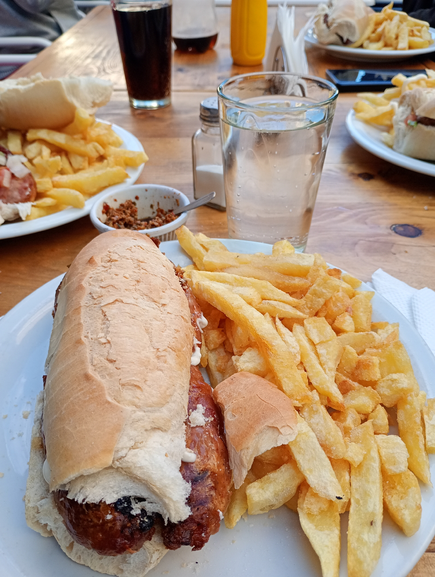 On a wooden table, a plate holding a choripán (a grilled chorizo sausage in a bread roll), and a heap of French fries dominates the foreground. Behind it, a glass of water and a small bowl with a redd…read more