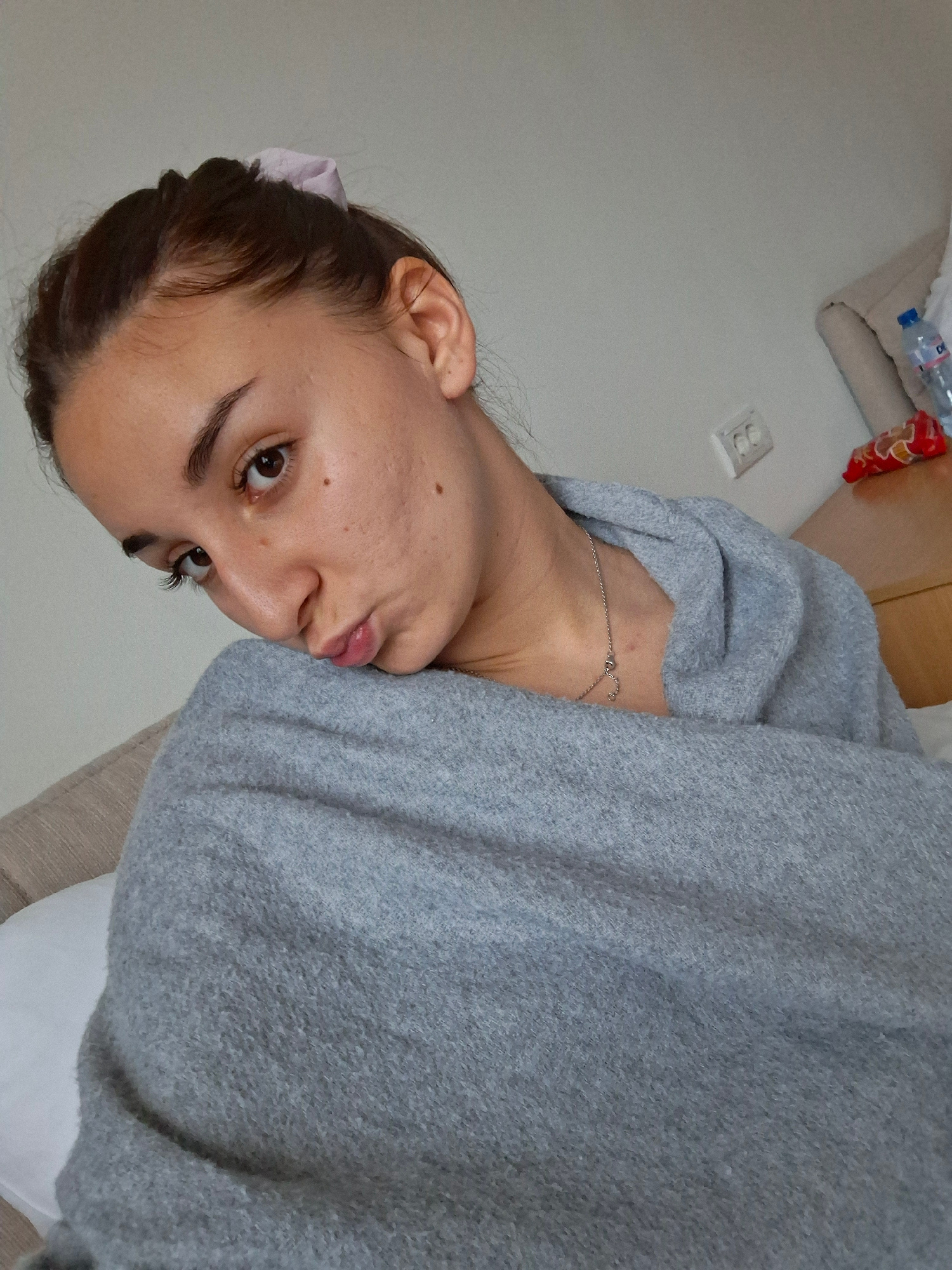 An indoor, close-up photograph depicts a young adult female, positioned diagonally, looking directly at the camera with a puckered lip expression. Her dark brown hair is pulled back, partially revealiβ¦read more