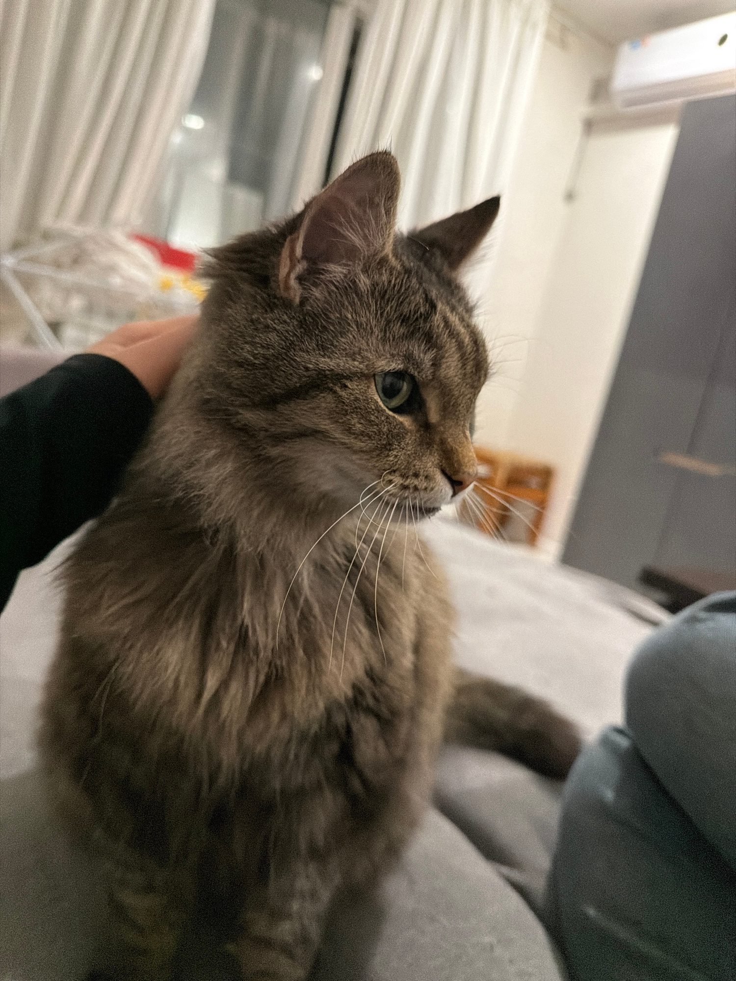 A tabby cat is lying on a gray fabric surface, possibly a couch or bed, and is being petted by a person wearing a black sleeve. The cat has gray, brown, and black fur, with long white whiskers. The ca…read more