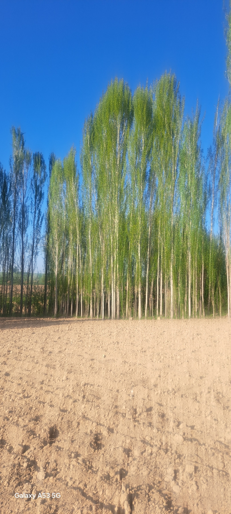 The image depicts a scene near Katta-Ravat, Uzbekistan, featuring a row of uniformly planted trees with white trunks and green foliage against a bright blue sky. The trees appear to be relatively youn…read more