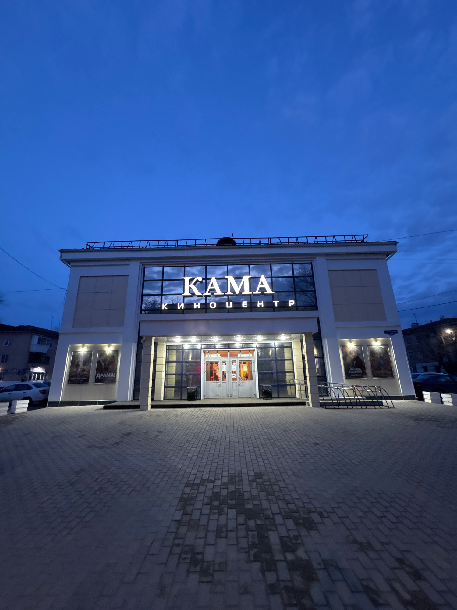 The image depicts the "Kama Cinema Center" located in Chaikovsky, Russia at dusk. The building is a two-story structure with a modern facade featuring large windows and a prominent illuminated sign di…read more