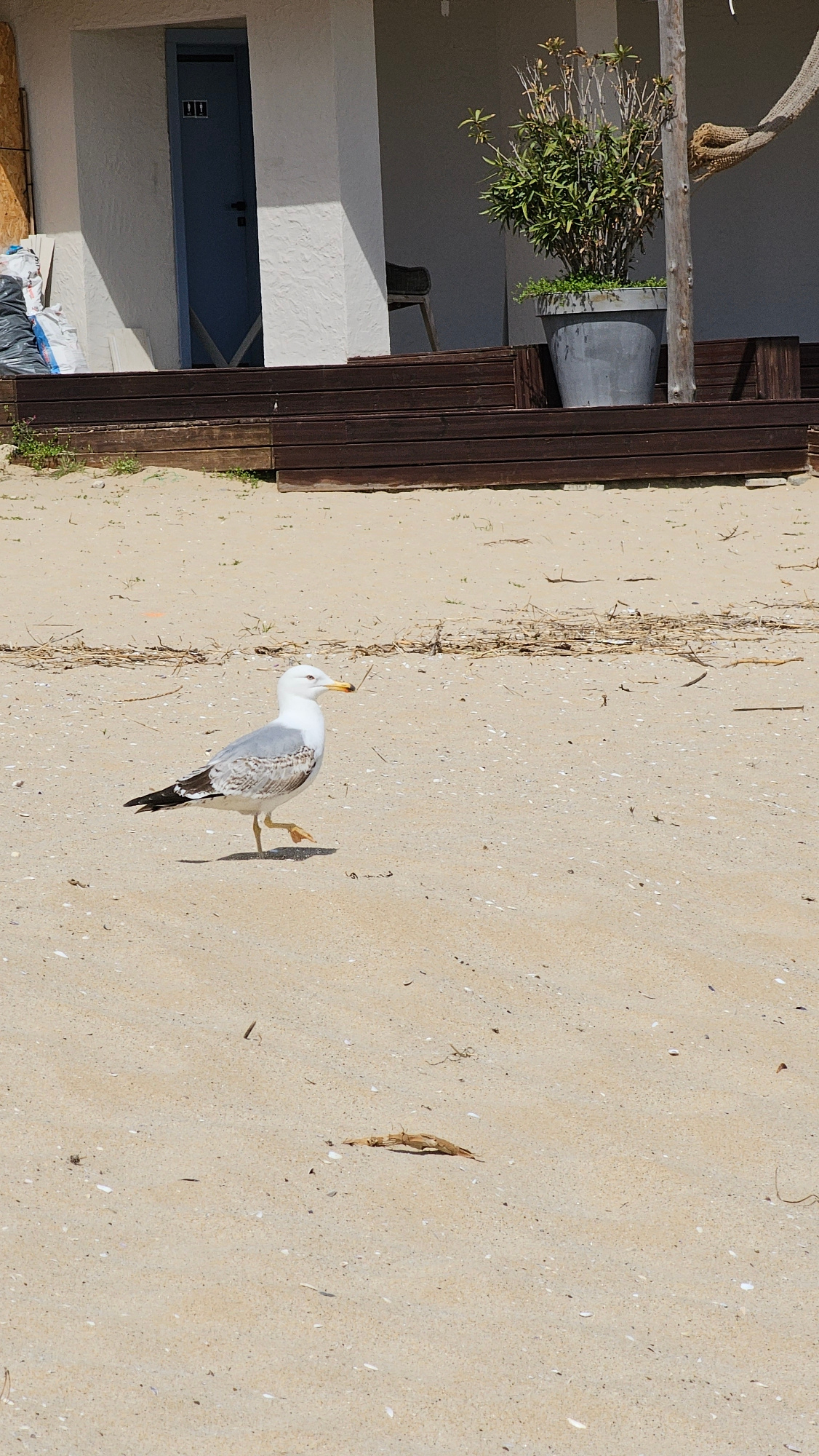 A medium-shot captures a seagull standing on a sandy surface, possibly a beach. The bird has white and grey plumage, and its head is turned towards the left side of the frame. A shadow cast by the sea…read more