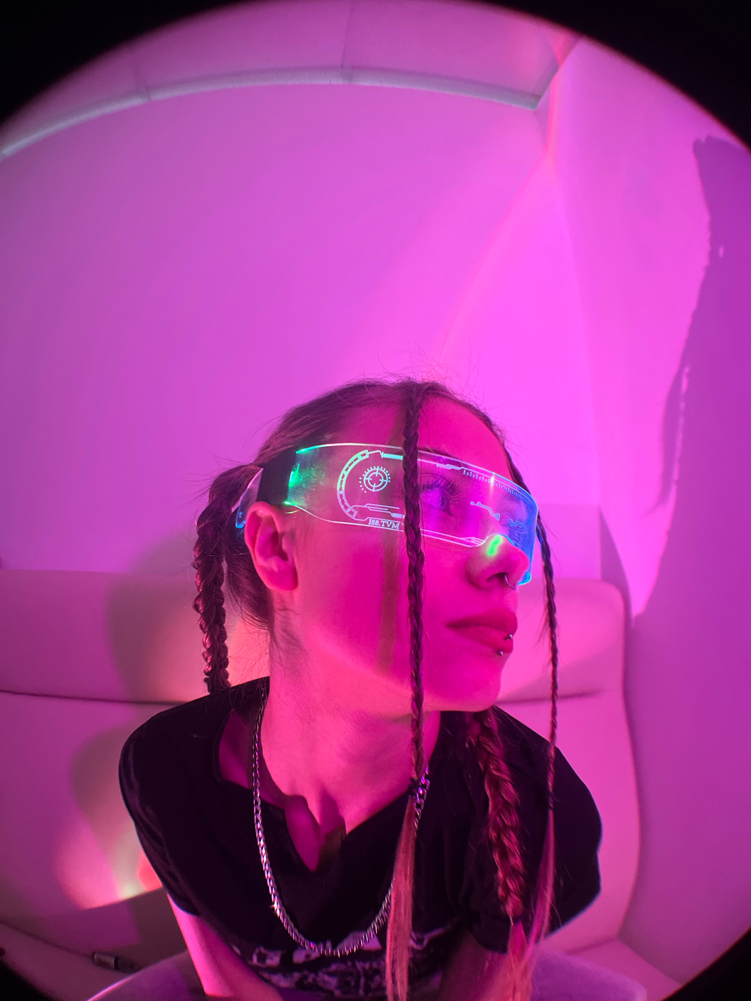 A person is shown from a low-angle perspective in a photograph that has been rotated counter-clockwise. The subject, who appears to be a young adult, is wearing futuristic-looking eyewear with illumin…read more