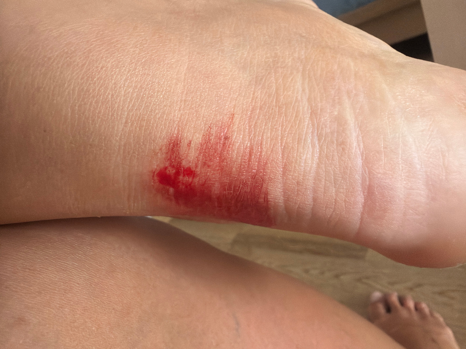 A close-up view shows a person's scraped foot or ankle with an open wound and fresh blood. The background is out of focus, showing another leg and toes. No information suggests this image was taken in…read more