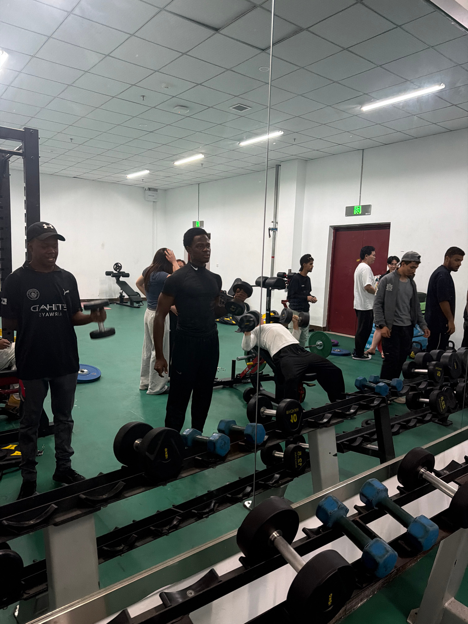 The image depicts the interior of a gymnasium in Jiangning District, China. Multiple individuals are engaged in weight training exercises. Weightlifting equipment such as dumbbell racks, benches, and…read more