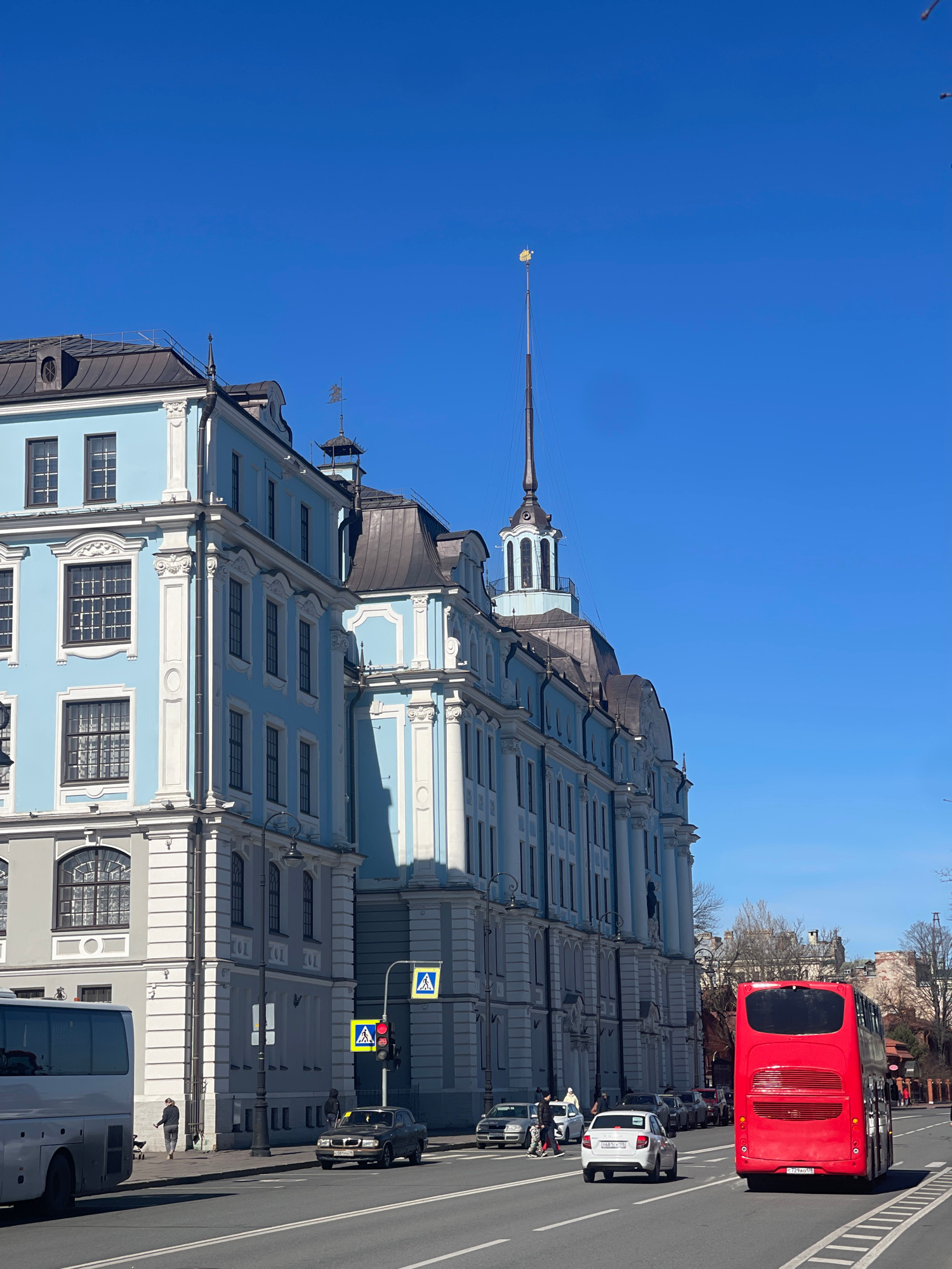 The image shows a light blue and white multi-story building in Saint Petersburg, Russia, with a tall spire topped with a golden weather vane. The building stands beside a road with traffic, including…read more
