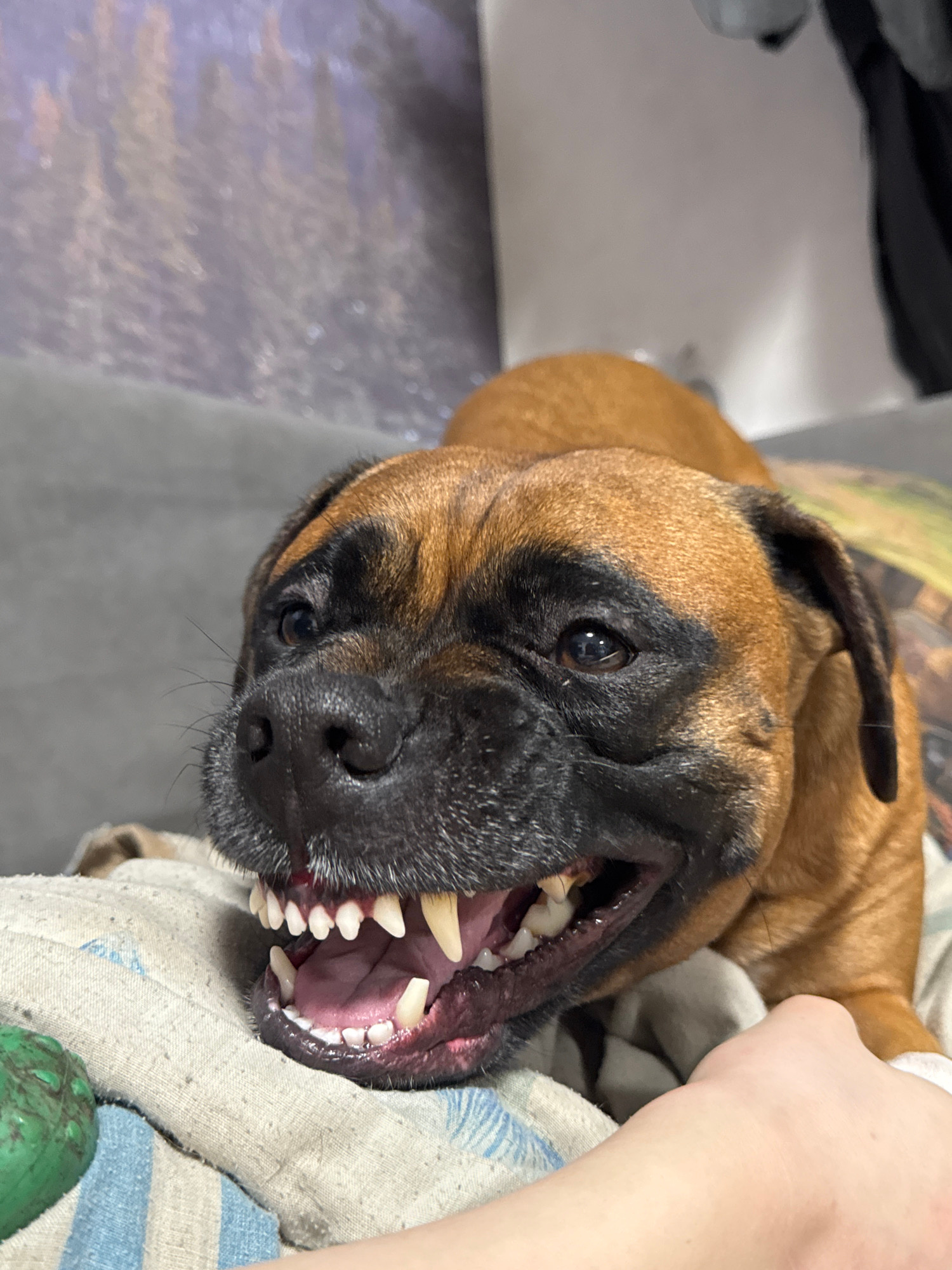 A medium-shot image depicts a brown Boxer dog lying on its back. The dog's mouth is wide open, displaying its teeth. The dog's face is predominantly black around the muzzle and eyes. A person's hand i…read more