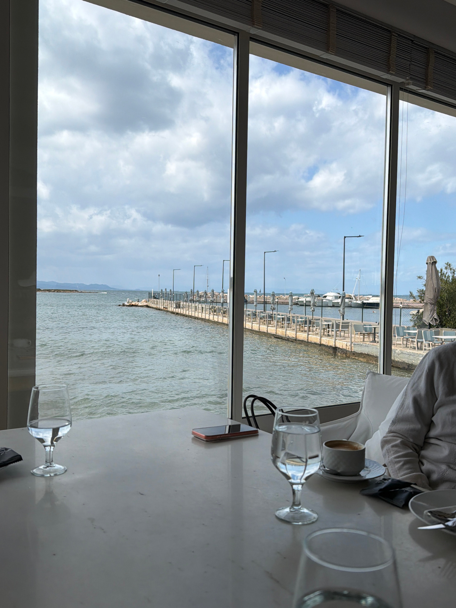 The image presents an interior view from a restaurant or cafe, looking out through large, multi-pane windows onto a marina located in Glifada, Greece. In the immediate foreground, a light-colored, po…read more