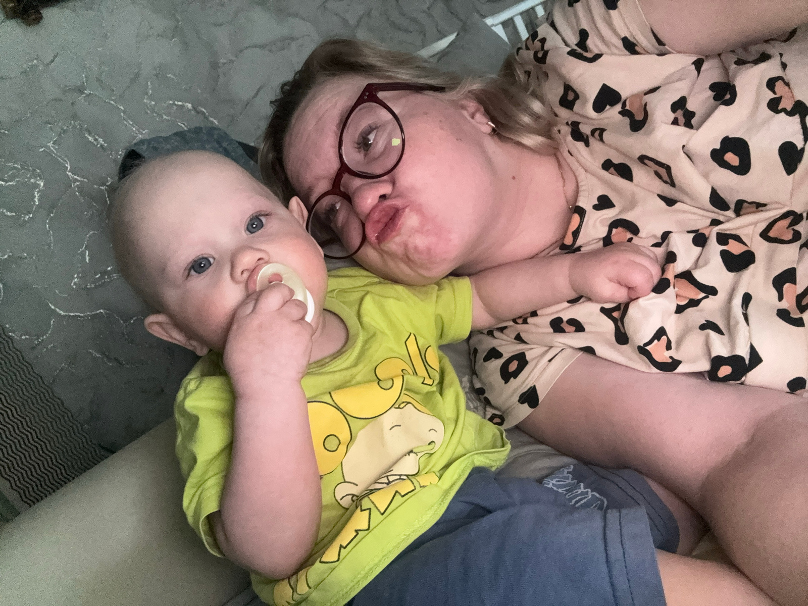 A baby and an adult woman are lying on a textured surface, likely a bed or sofa, in an indoor setting. The baby, with a pacifier in his mouth, is wearing a bright green t-shirt with a cartoon characte…read more