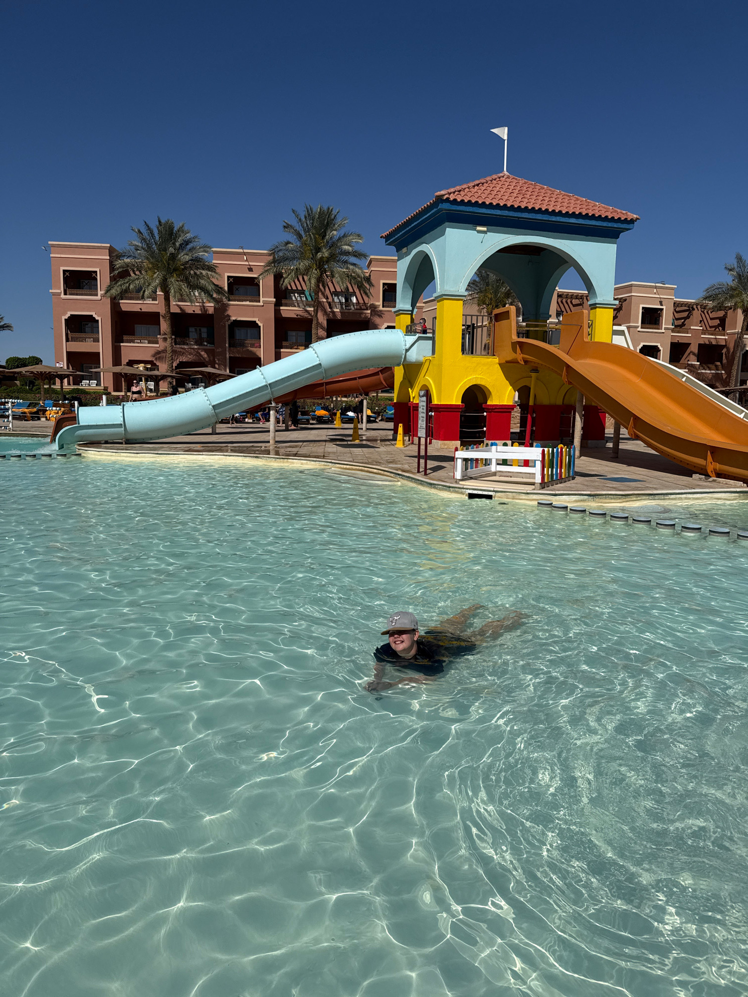 A medium-level shot shows a person swimming in the pool beside a waterside with a building in the background in an unknown location in Egypt. The person is swimming in the pool, wearing a dark shirt…read more