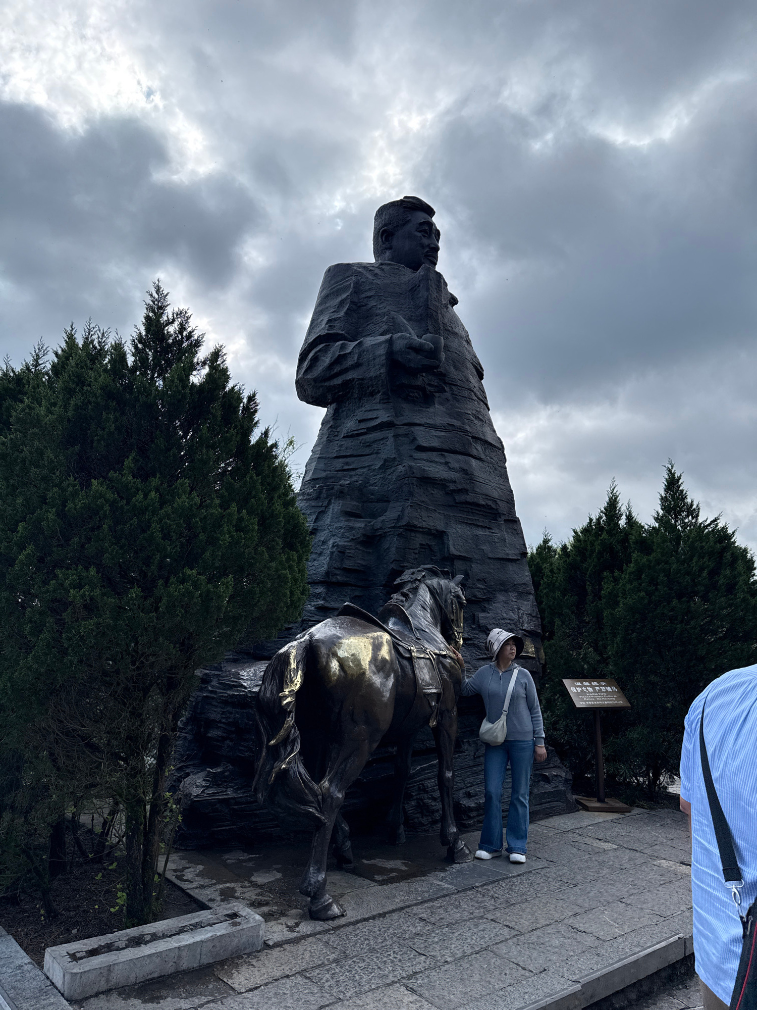 A low-angle, portrait-oriented shot shows a large bronze sculpture of a man on horseback, taken from slightly below eye-level. To the right of the sculpture, a woman wearing a white helmet and gray ja…read more