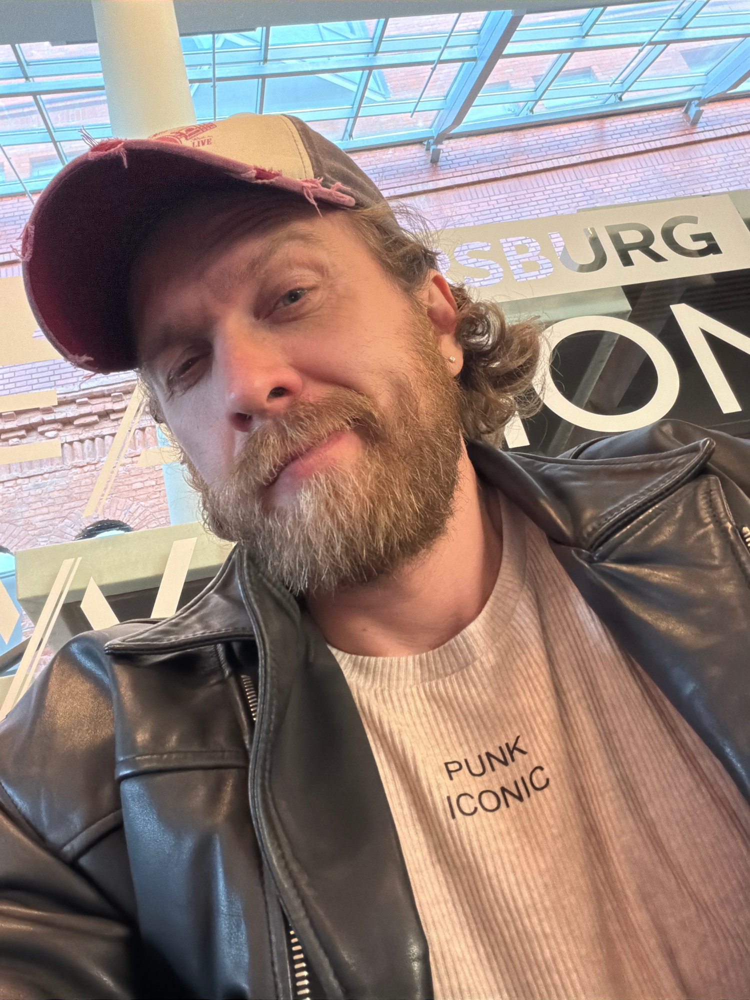 A medium close-up, slightly tilted portrait shows a man with a light brown beard and curly hair, wearing a black leather jacket, a light beige ribbed long-sleeved shirt, and a distressed burgundy and…read more