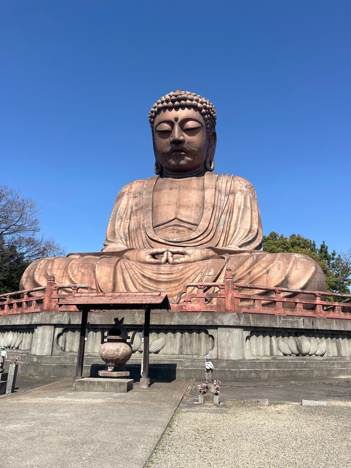 The image displays the colossal Shuraku-en Daibutsu, a large seated Buddha statue, situated in Tokai, Japan. The statue, rendered in a bronze-like material and appearing weathered, occupies the majori…read more