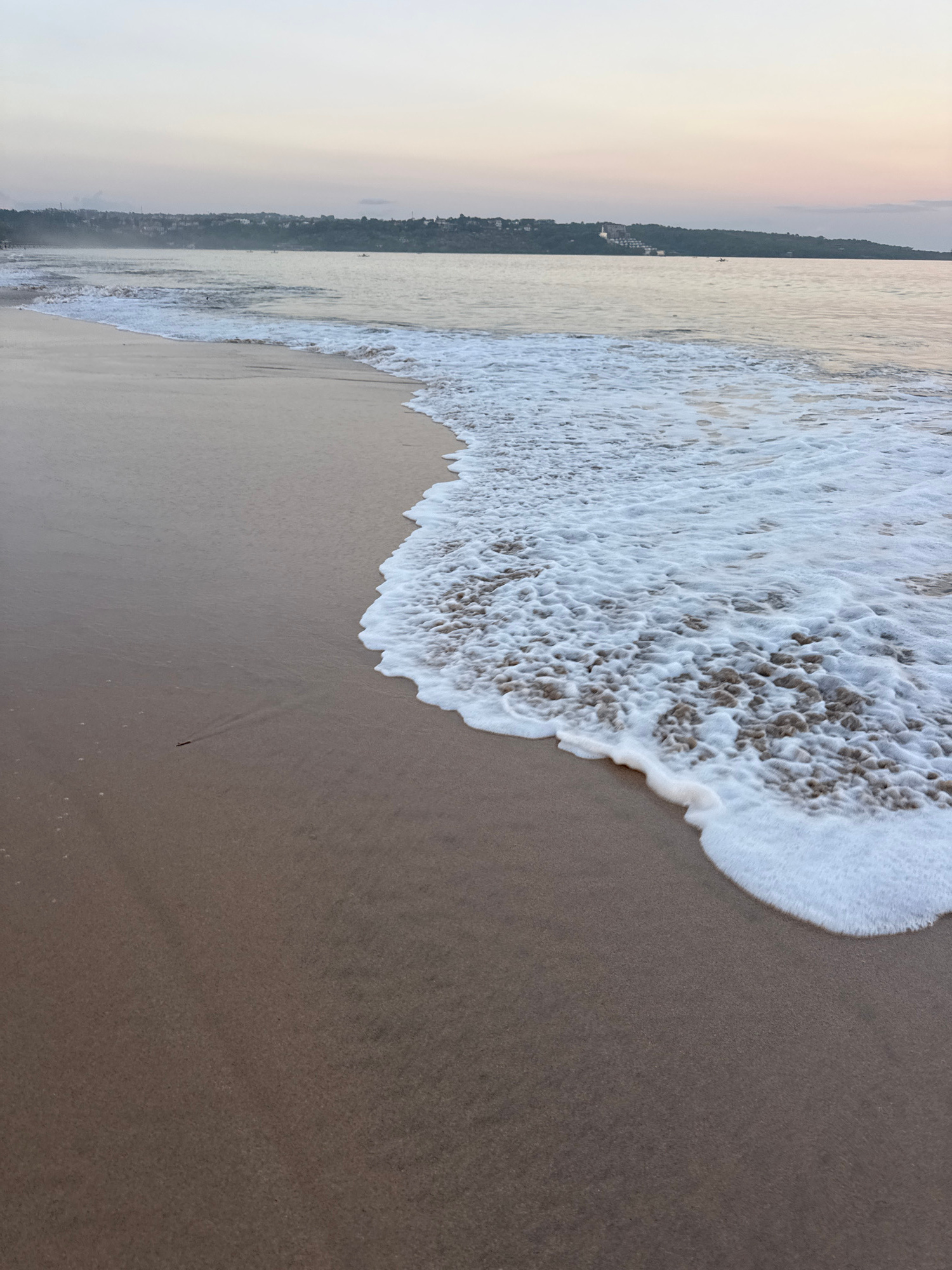 A tranquil scene unfolds at Kuta Beach in Kuta, Indonesia. The image captures a serene shoreline where the frothy white waves gently meet the brown sand. The ocean is visible on the right, transitioni…read more