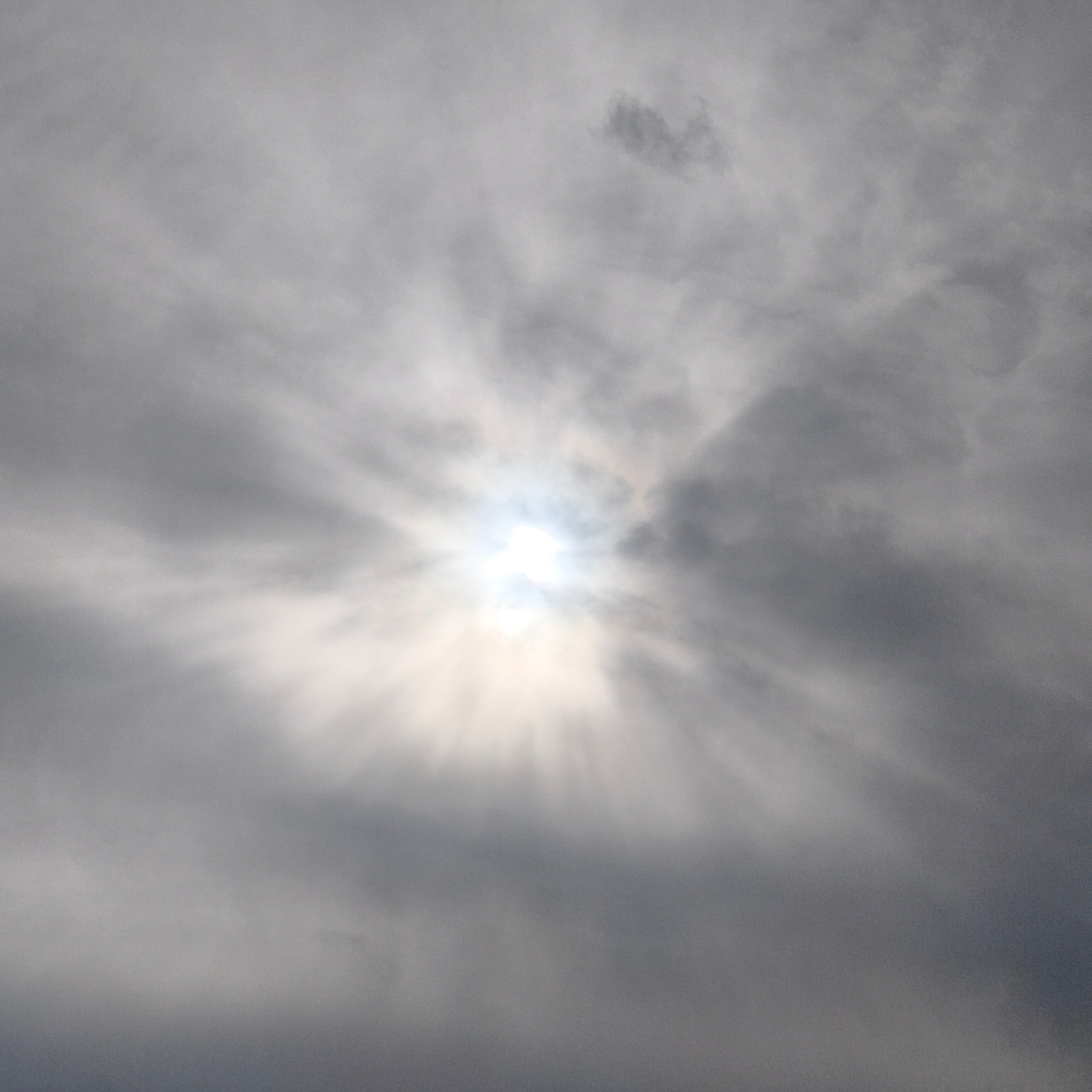 The image depicts a cloudy sky with a bright light source, likely the sun, obscured by the clouds. Rays of light are emanating from behind the cloud cover. The overall color palette is grayscale, domi…read more