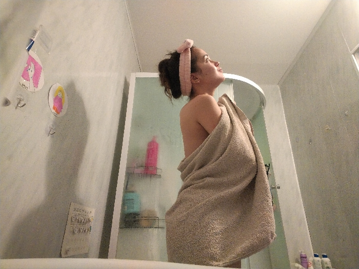 The image captures a woman in a bathroom, likely either just before or after a shower. She is seen from the side, wrapped in a large, light beige towel that covers her body from her chest downwards. H…read more