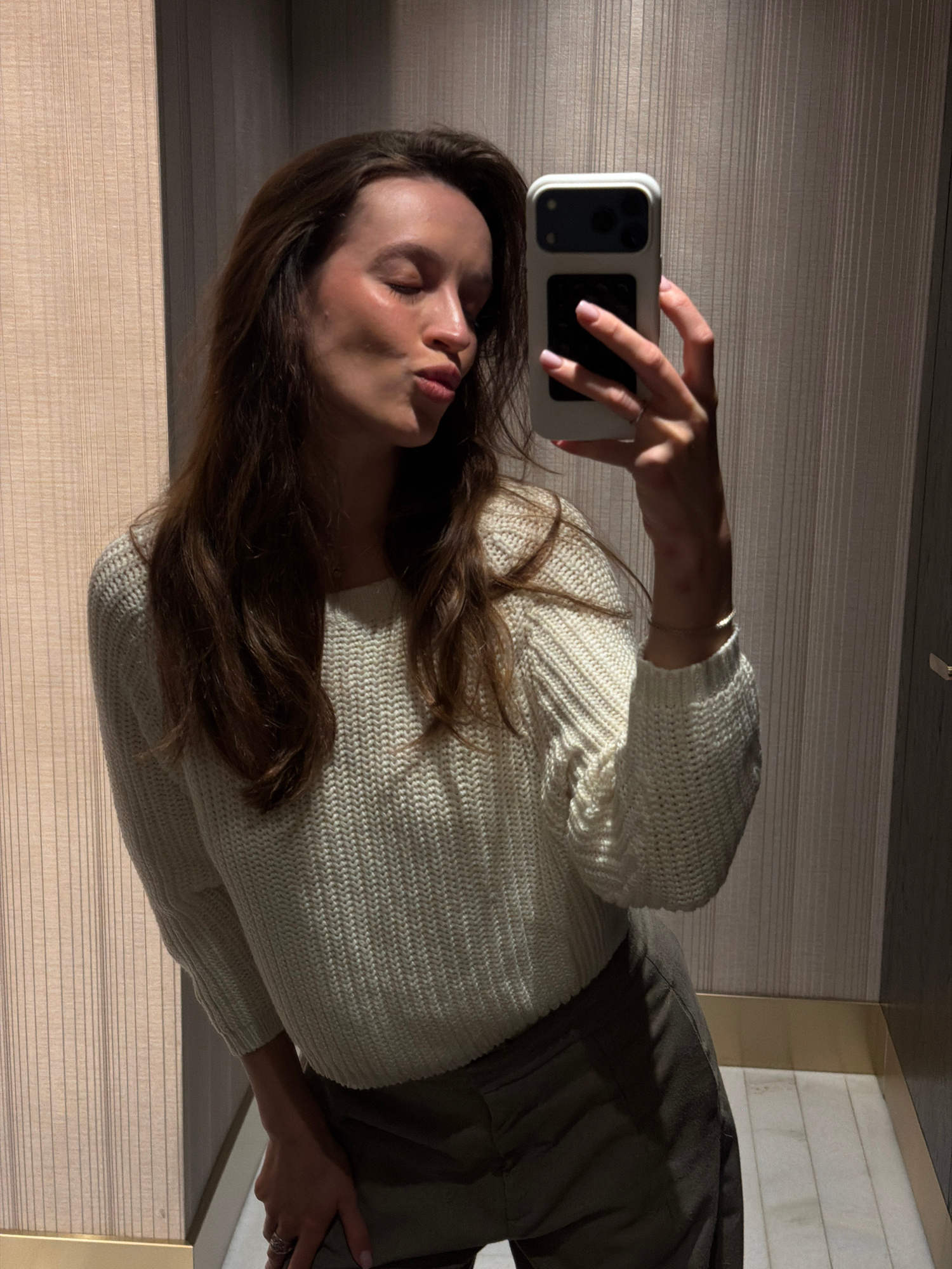 A medium shot captures a young woman taking a selfie indoors. She holds a white-cased smartphone in her left hand, her pink fingernails visible. She is wearing a chunky knit sweater in an off-white co…read more