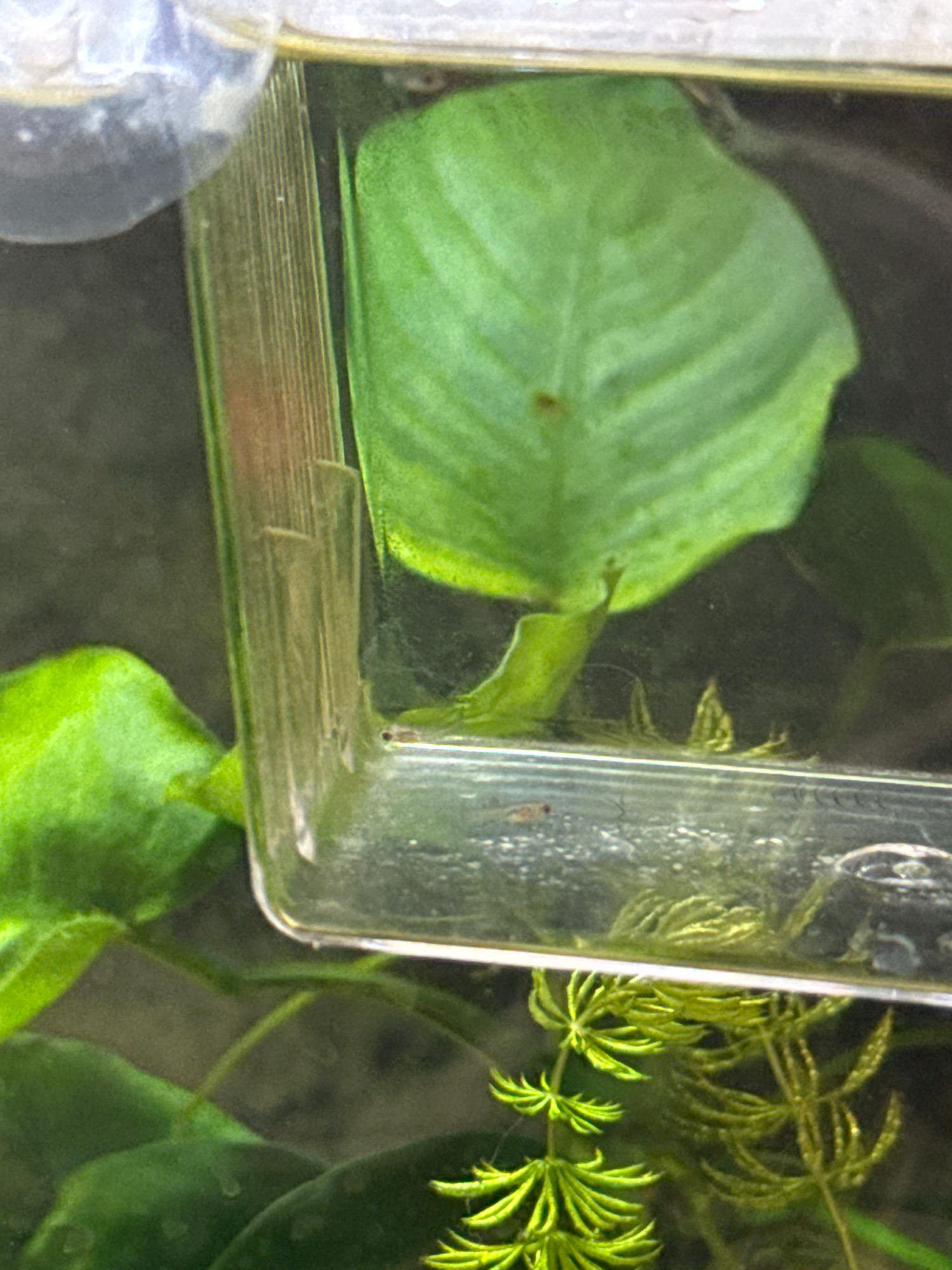 A close-up shot depicts an aquarium environment, likely domestic. Dominating the frame are various aquatic plants, including broad-leafed species and feathery, needle-like greenery. A clear, rectangul…read more