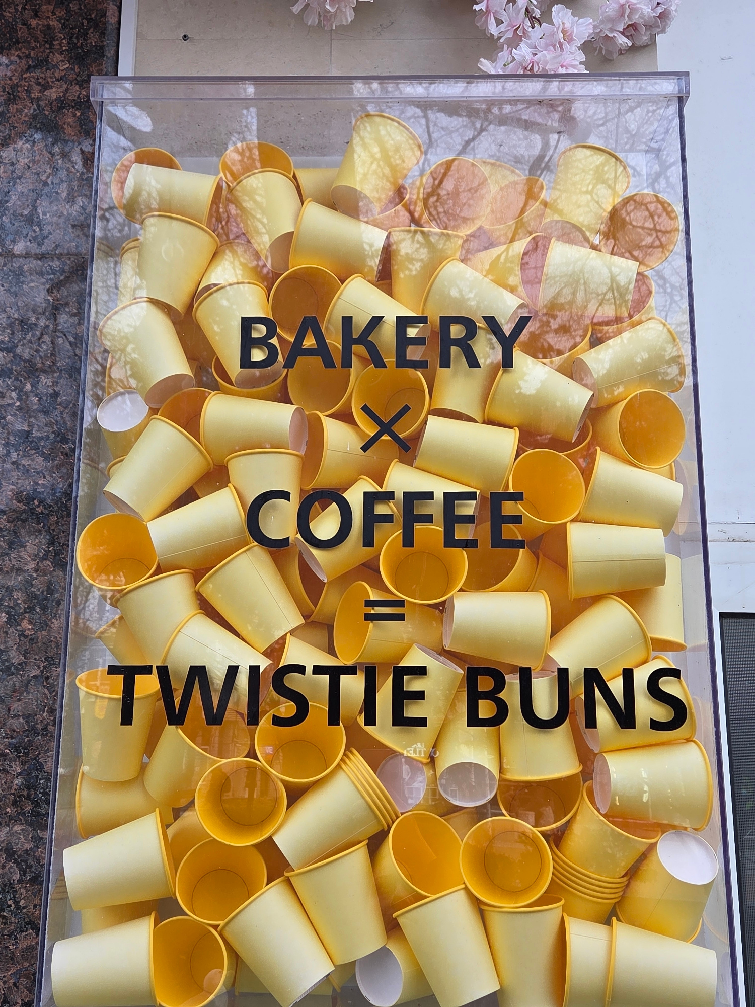The image shows a clear, rectangular display case filled with yellow paper cups. The front of the case is printed with the words "BAKERY X COFFEE = TWISTIE BUNS" in black lettering. Some of the cups a…read more