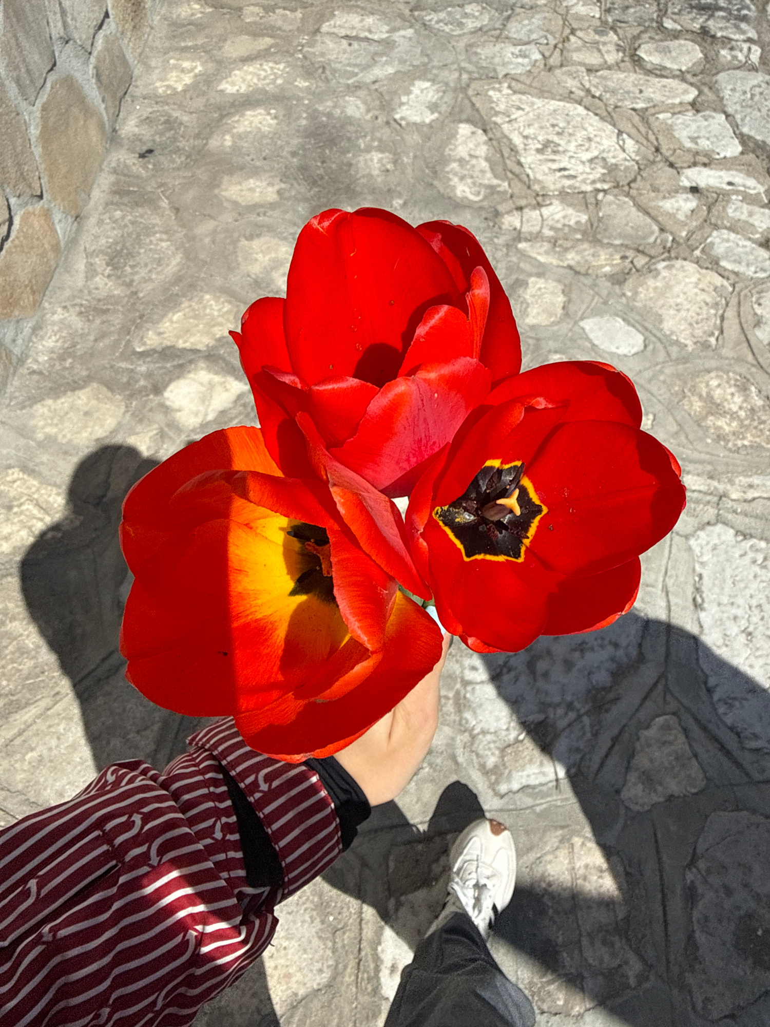 Here is a detailed description of the image: The image shows a close-up, high-angle shot of a person holding a bouquet of three vibrant red tulips against a stone background. The tulips are the primaβ¦read more