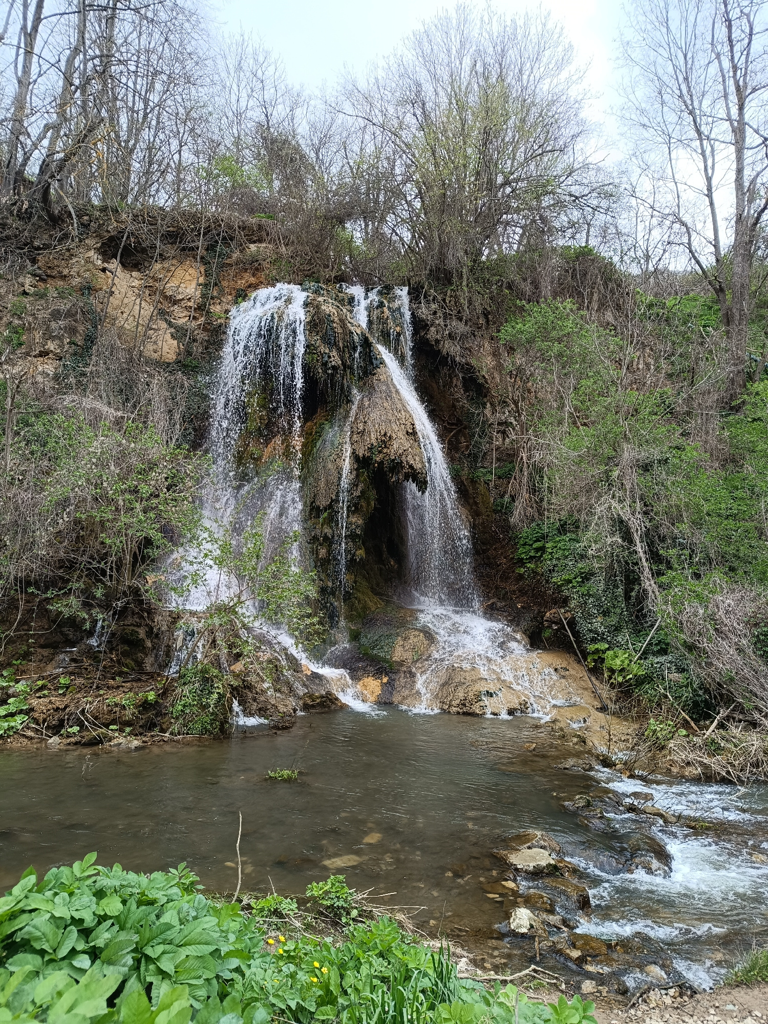 The image depicts a waterfall in Paidushko, Bulgaria. The waterfall cascades down a rocky cliff covered in moss and vegetation, forming a pool at its base. Bare trees and bushes surround the waterfall…read more