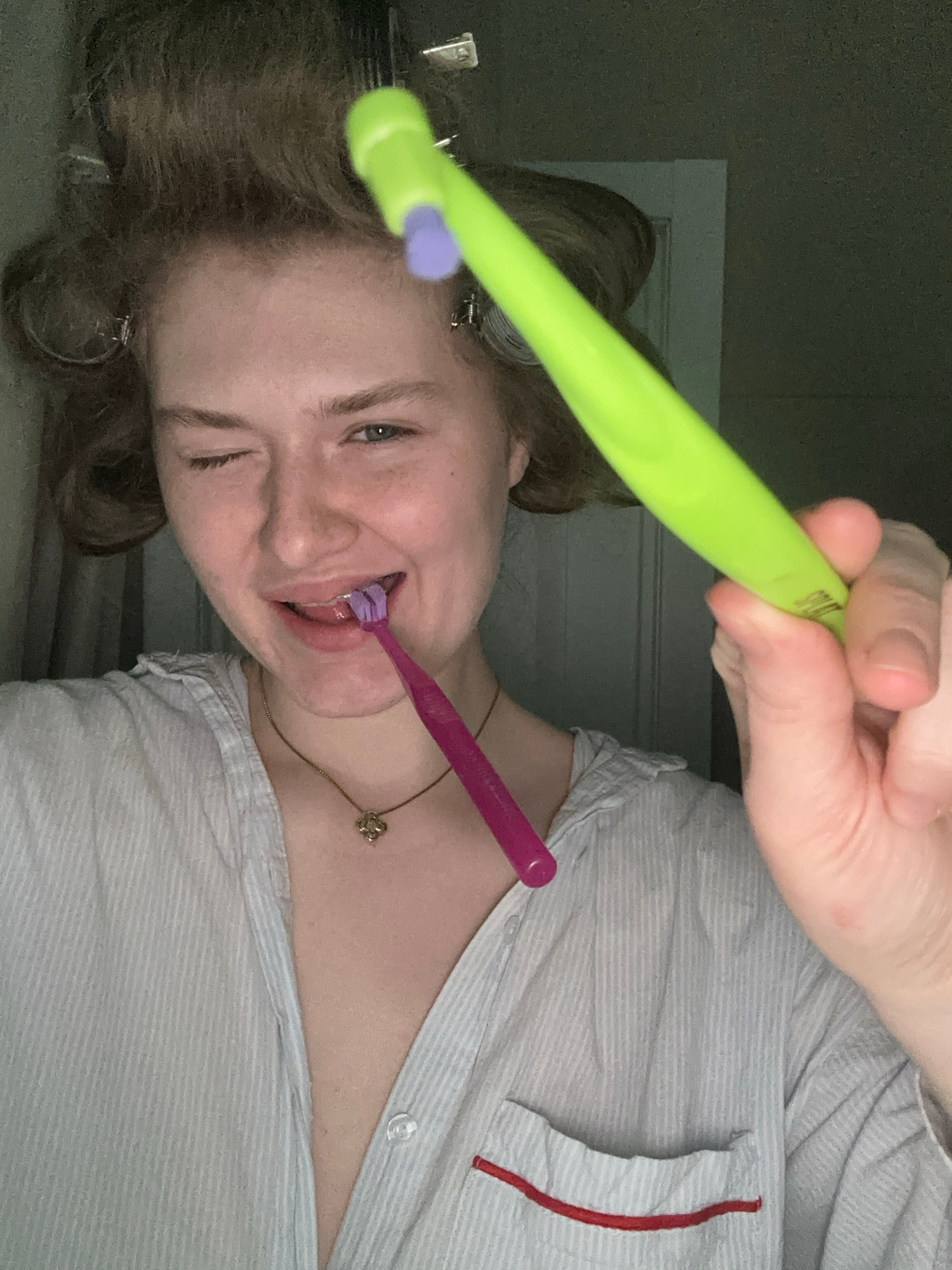 A woman is brushing her teeth with two toothbrushes, one purple and one neon green. She is wearing a striped shirt with red trim. Her hair is in curlers. She is also wearing a necklace. The location of the image is not discernible. | Open Wire