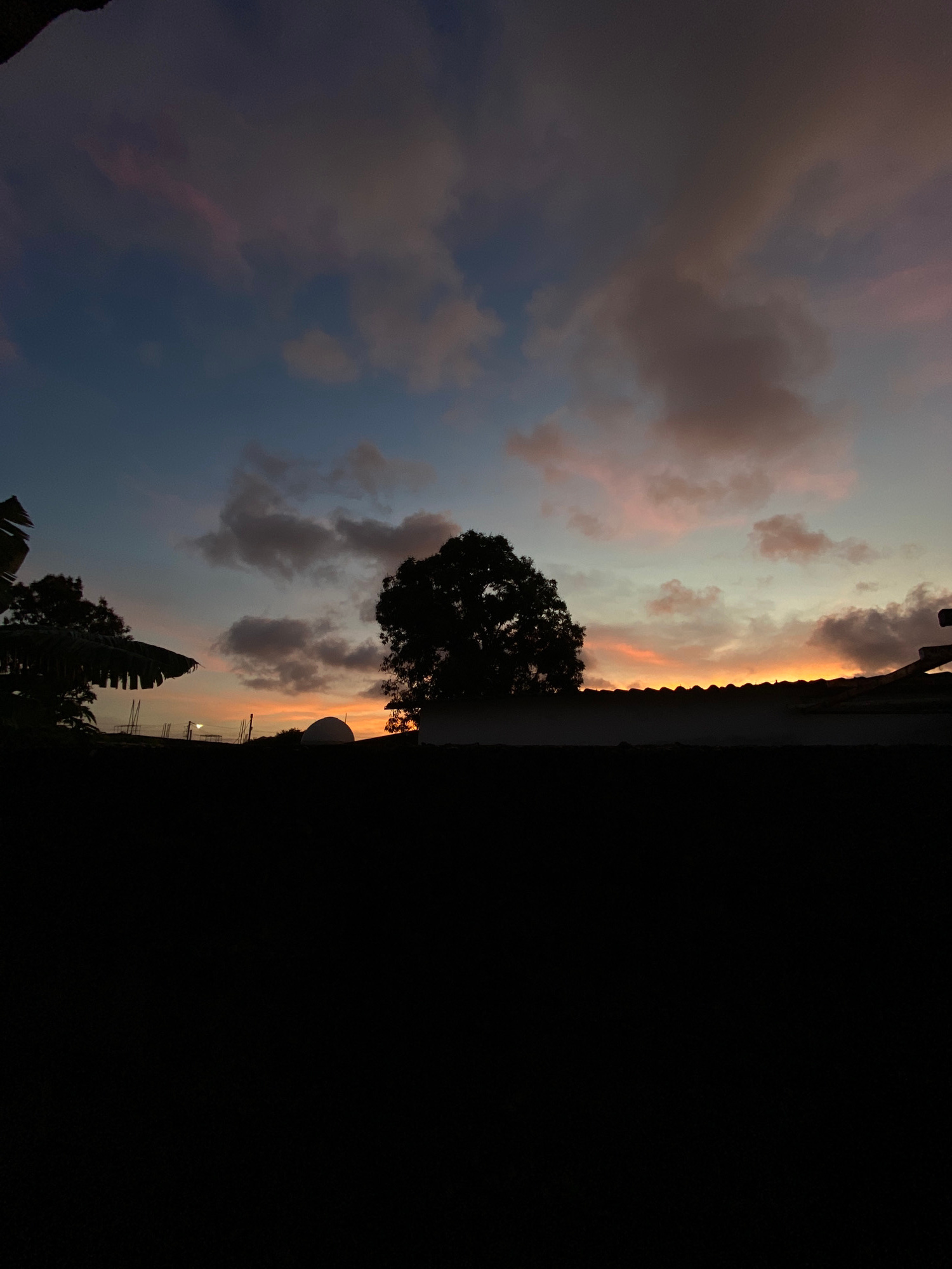 The image depicts a sunset in Juan Griego, Venezuela. The sky is a mix of blue, gray, and pink clouds, with a bright orange glow near the horizon. A tree is silhouetted against the sunset. In the fore…read more