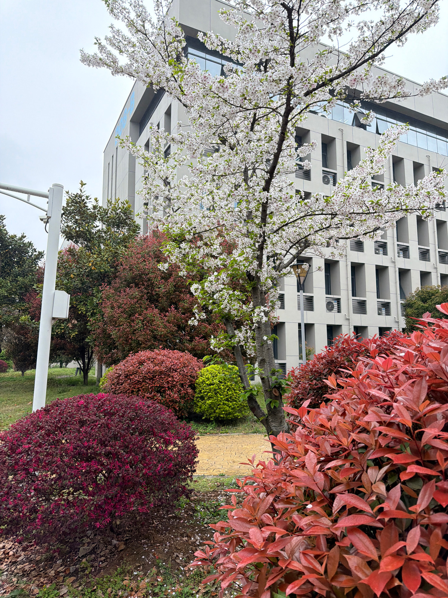 The image depicts a scene in the Jiangning District of China, showcasing a combination of nature and urban elements. A flowering tree with white blossoms stands prominently, partially obscuring a mult…read more