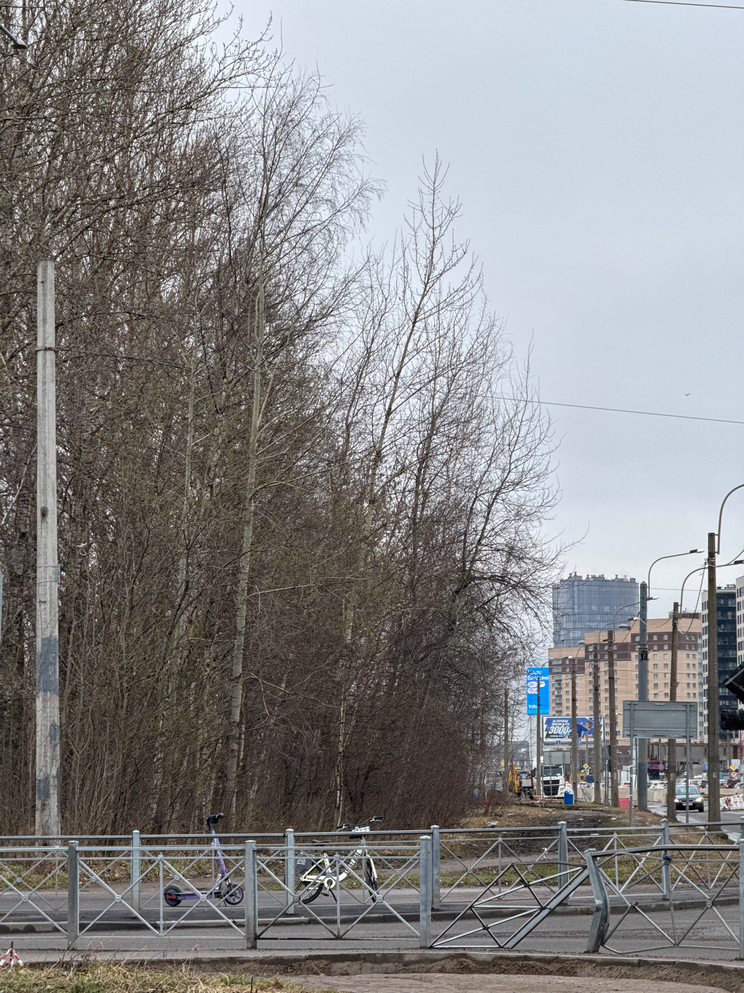 The image depicts a street scene in Saint Petersburg, Russia. In the foreground is a row of bare trees lining a roadside with a metal guardrail. Behind the trees, commercial buildings and billboards a…read more