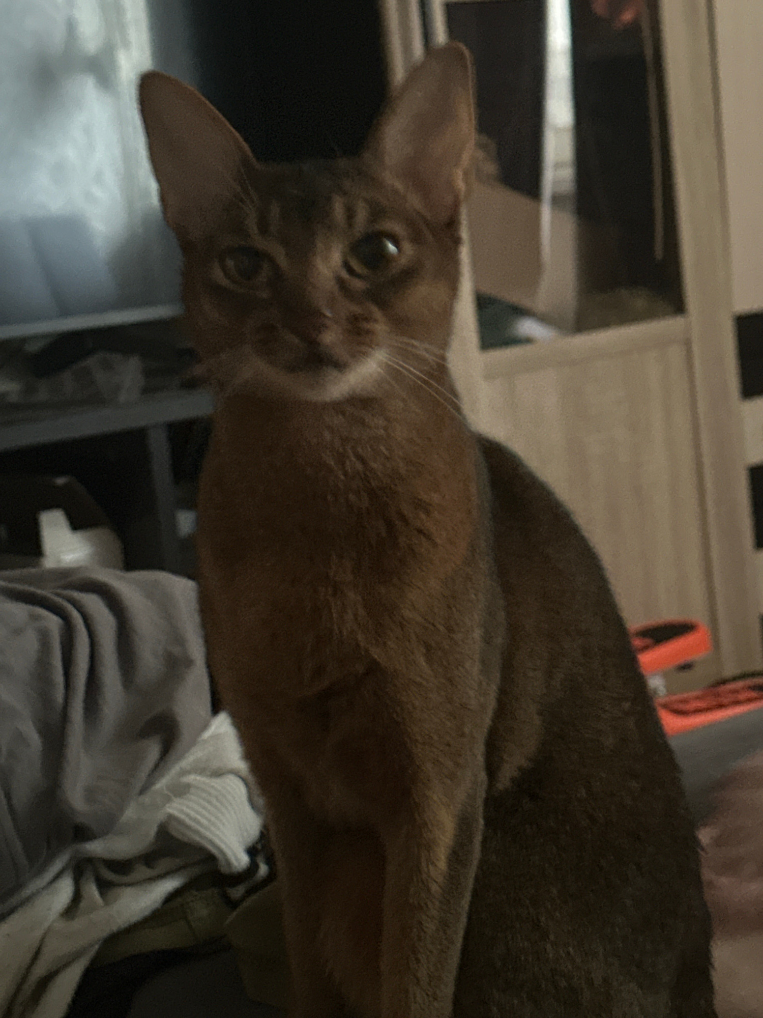An Abyssinian cat with ticked reddish-brown fur and prominent ears is the central subject of this indoor photograph. The cat's head is tilted, and it looks directly at the camera with large, expressiv…read more
