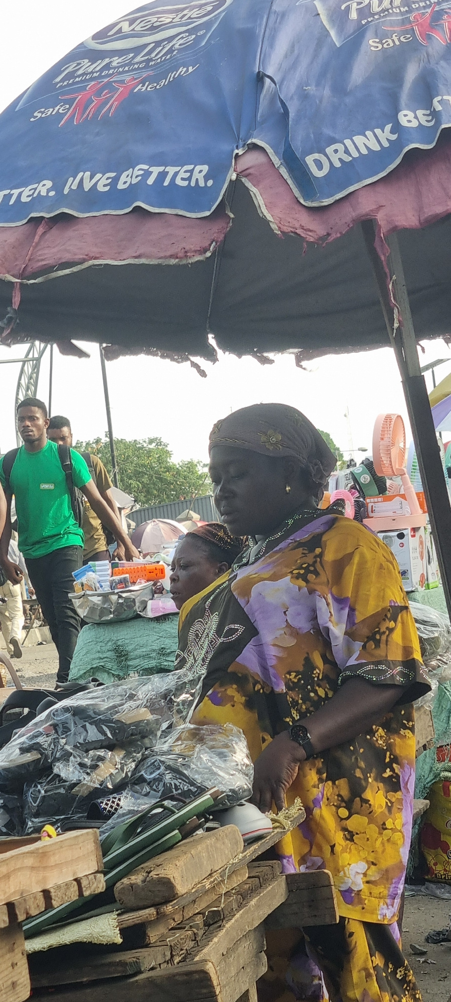 This outdoor image shows a market scene in what appears to be Lagos, Nigeria. Two African women, one wearing a yellow and purple floral top, are focused on items displayed on a wooden surface. One has on a head covering. A man wearing a green shirt is visible in the background. Items for sale include white containers and long green objects. Overhanging the scene is a partially damaged blue umbrella with marketing for "Nestle Pure Life" drinking water. The overall setting suggests a bustling market environment. | Open Wire