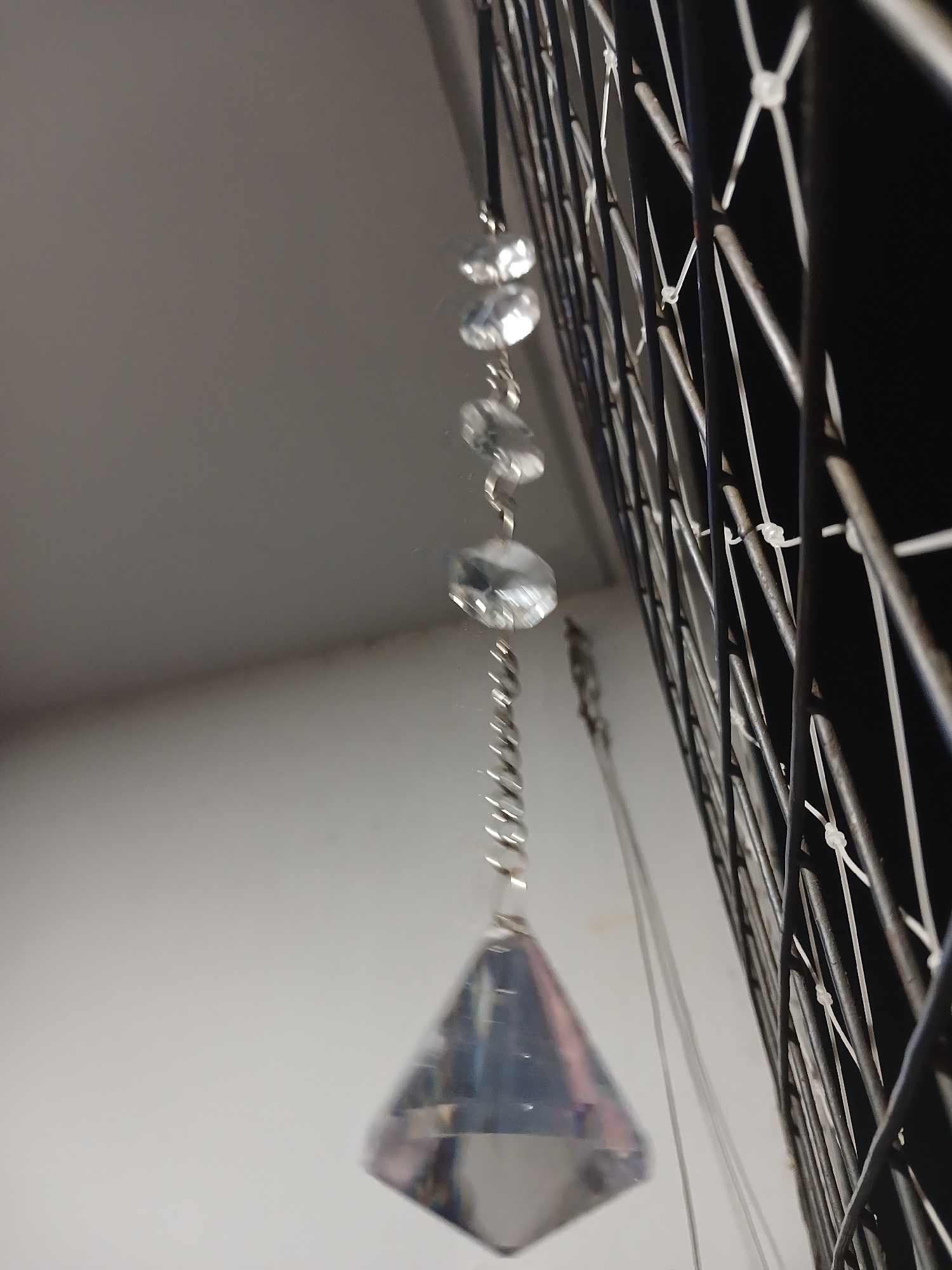 The image shows a crystal prism hanging from a wire grid with metal bars. The prism is elongated and has a pointed end. It is attached to the grid with a thin wire. The wire has small, clear beads att…read more