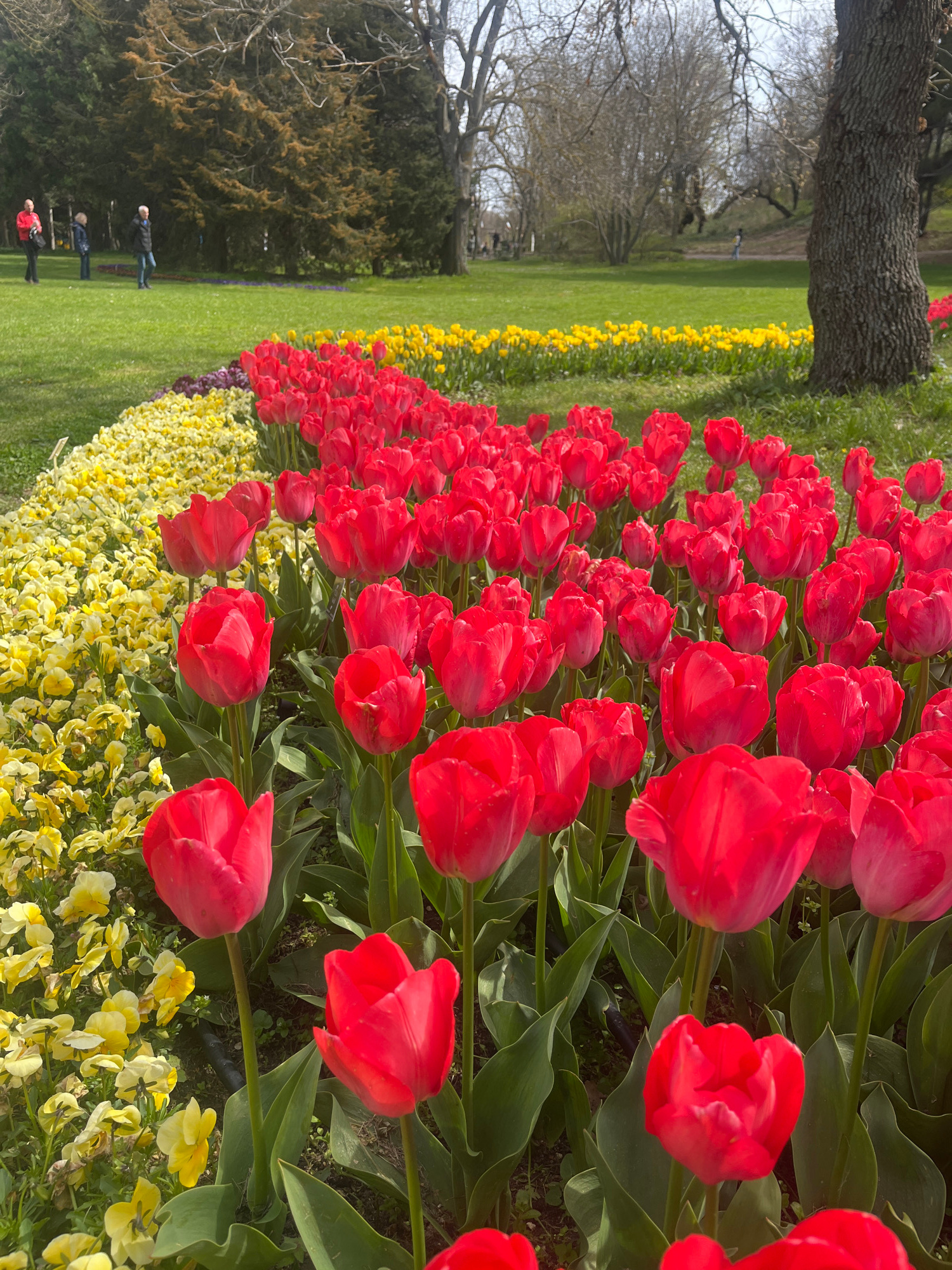 A photograph taken in Varna, Bulgaria, displays a vibrant flowerbed featuring rows of red tulips bordered by yellow pansies. The flowers curve along the pathway of a park or garden. Trees line the gra…read more