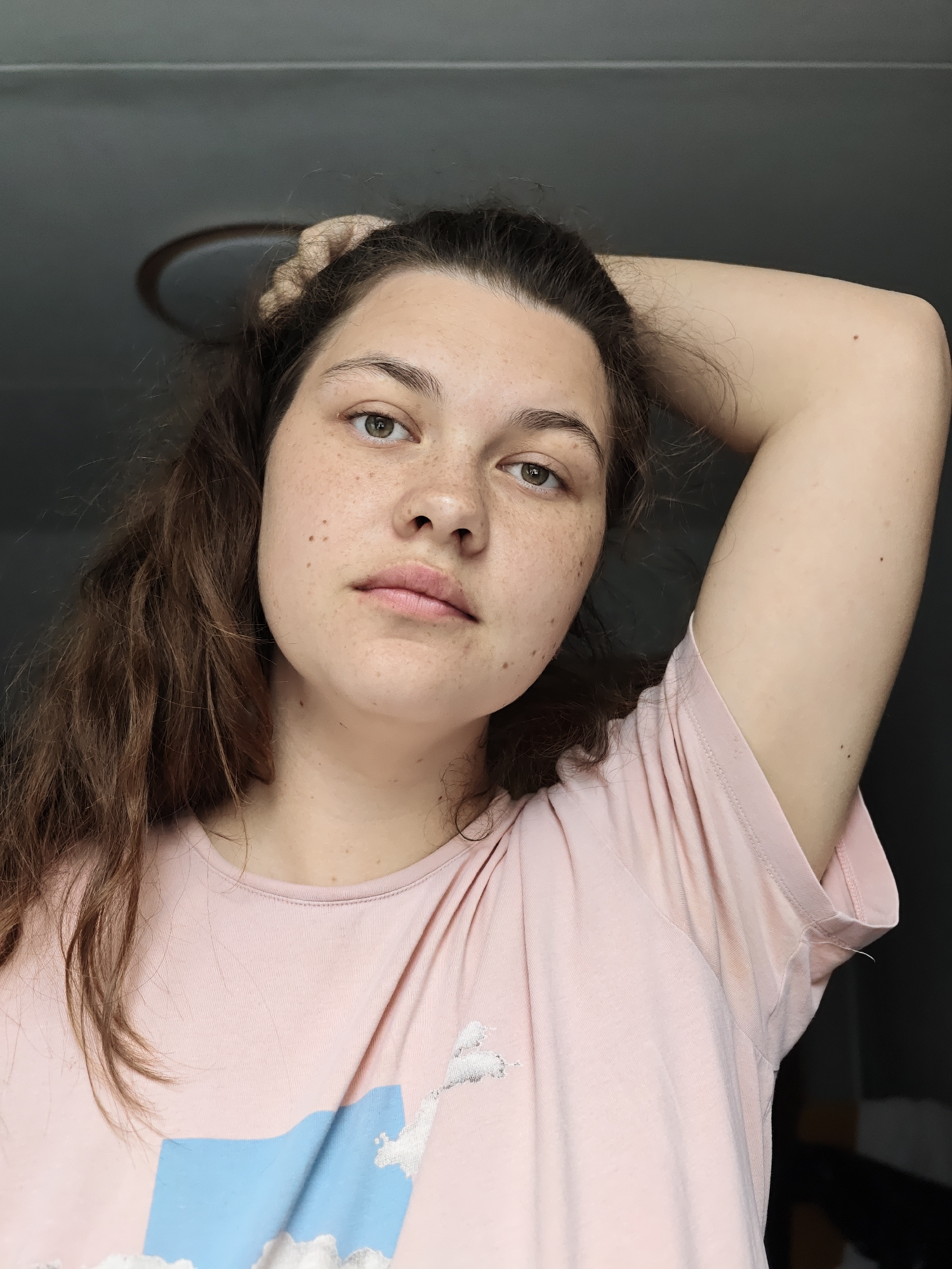 A young woman with light brown hair and fair skin stands indoors, facing the camera. Her hair is partially pulled back with a light brown scrunchie. She has freckles on her face. Her left arm is raise…read more