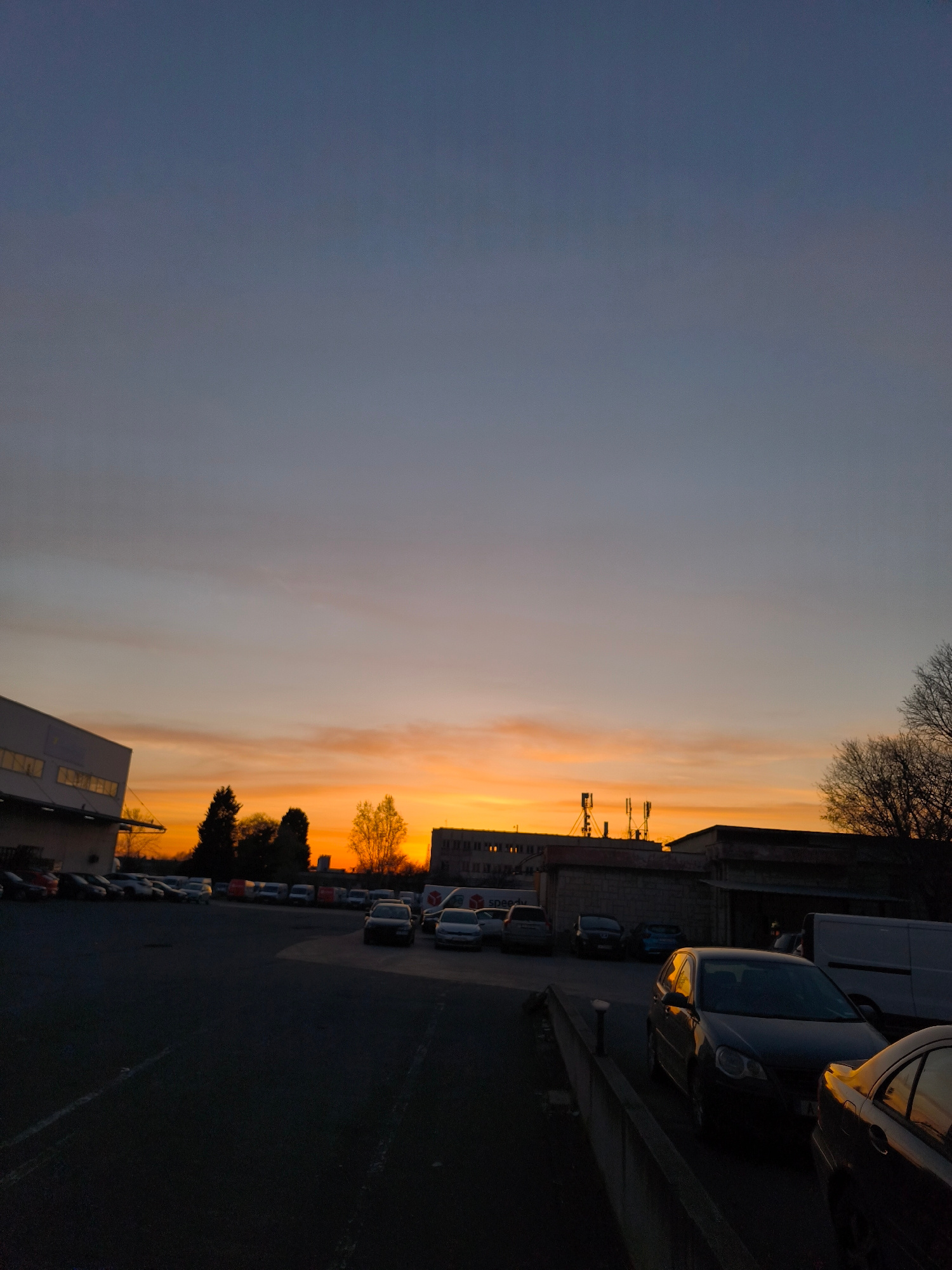 The image shows a parking lot at dusk in what is likely Burgas, Bulgaria. The sky transitions from deep blue to orange and red at the horizon, where the sun has just set or is about to rise. Several b…read more