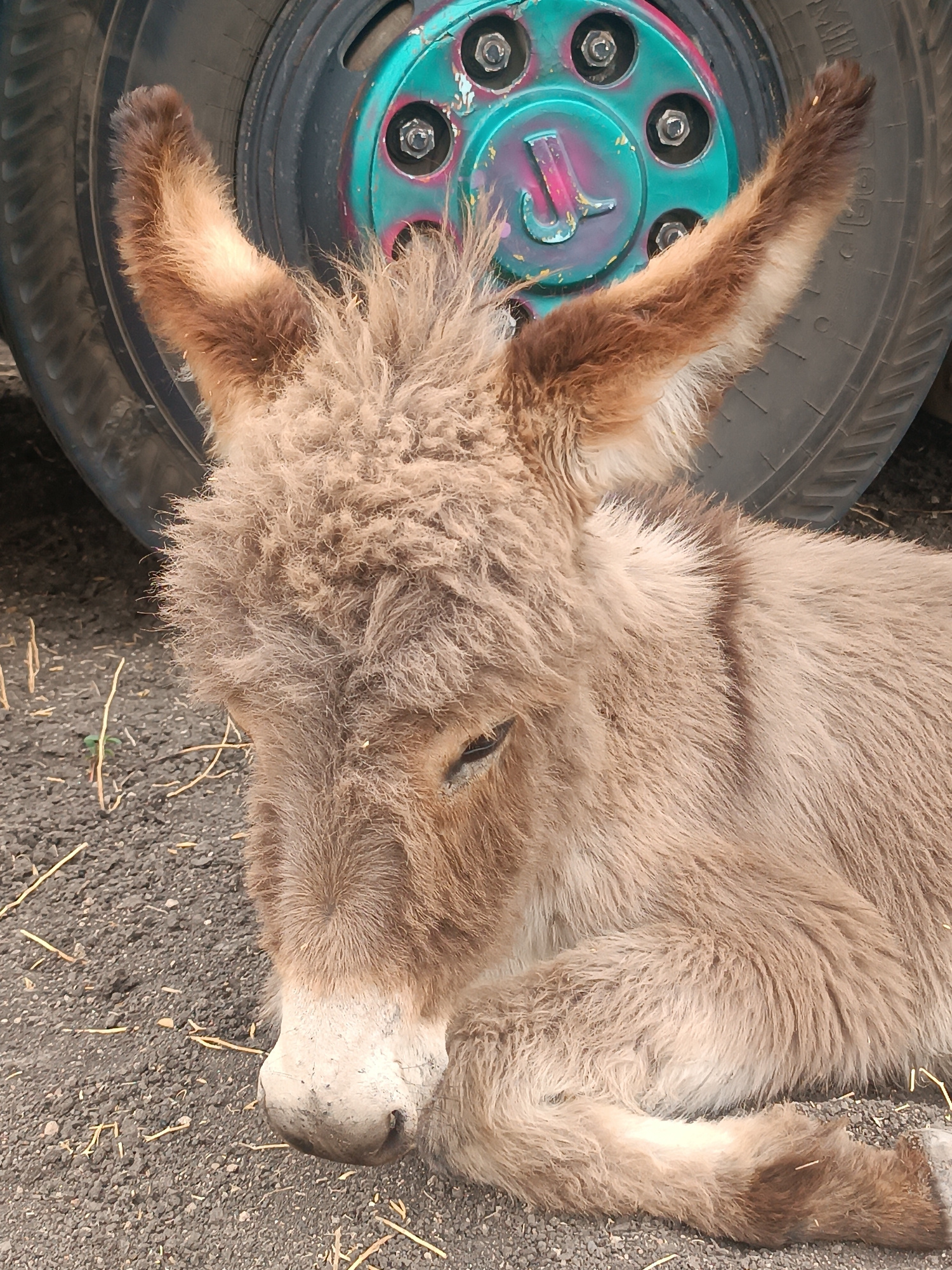 In Kottalapalli, India, a light brown, fluffy donkey is observed lying on dark, gravelly ground interspersed with dry straw. The animal rests on its left side, with its head resting on the ground and…read more