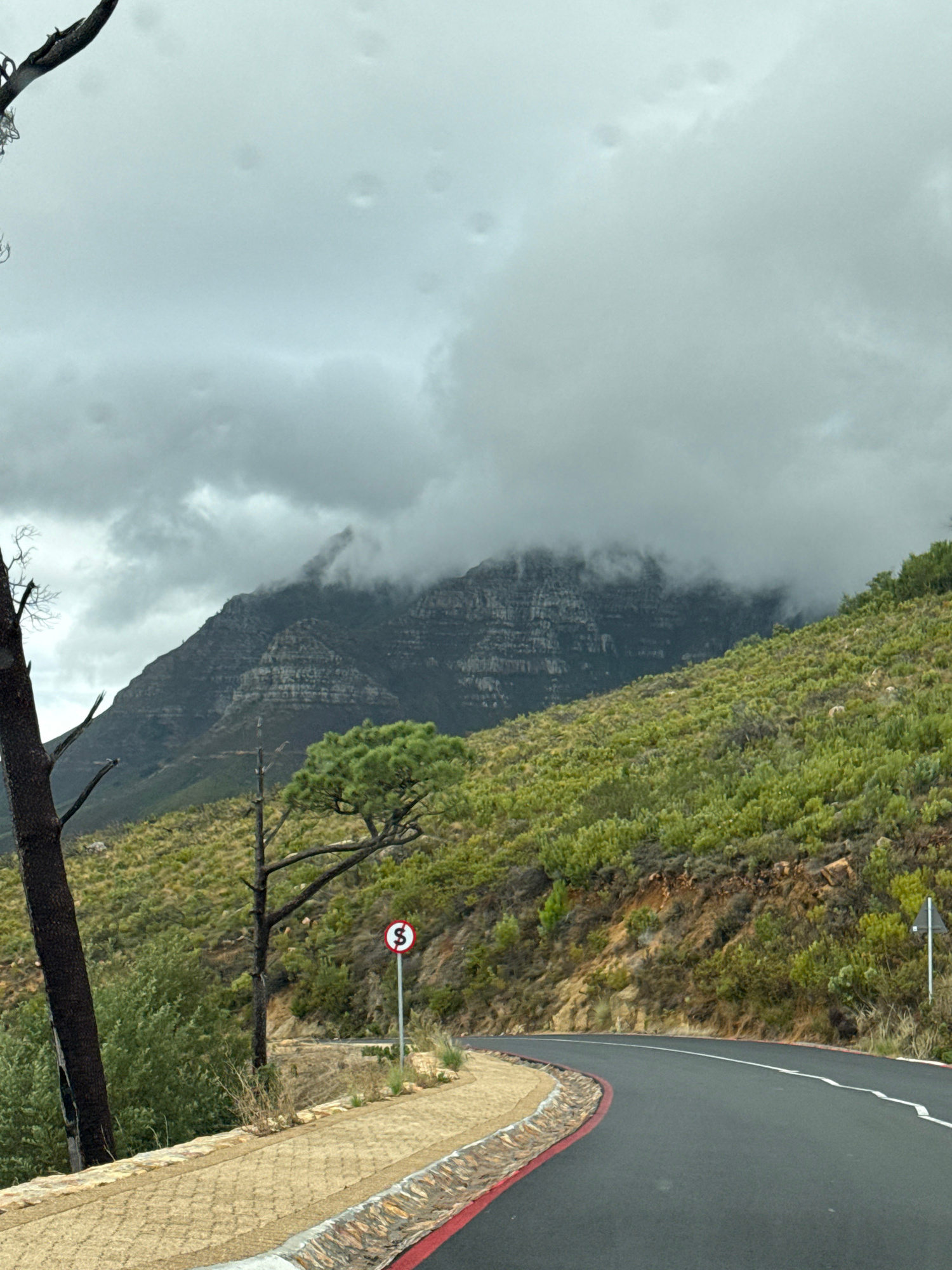 The image depicts a mountain scene in Cape Town, South Africa, likely along a winding road. A mountain face is visible, partially obscured by clouds. The vegetation on the mountain slopes consists ofโฆread more