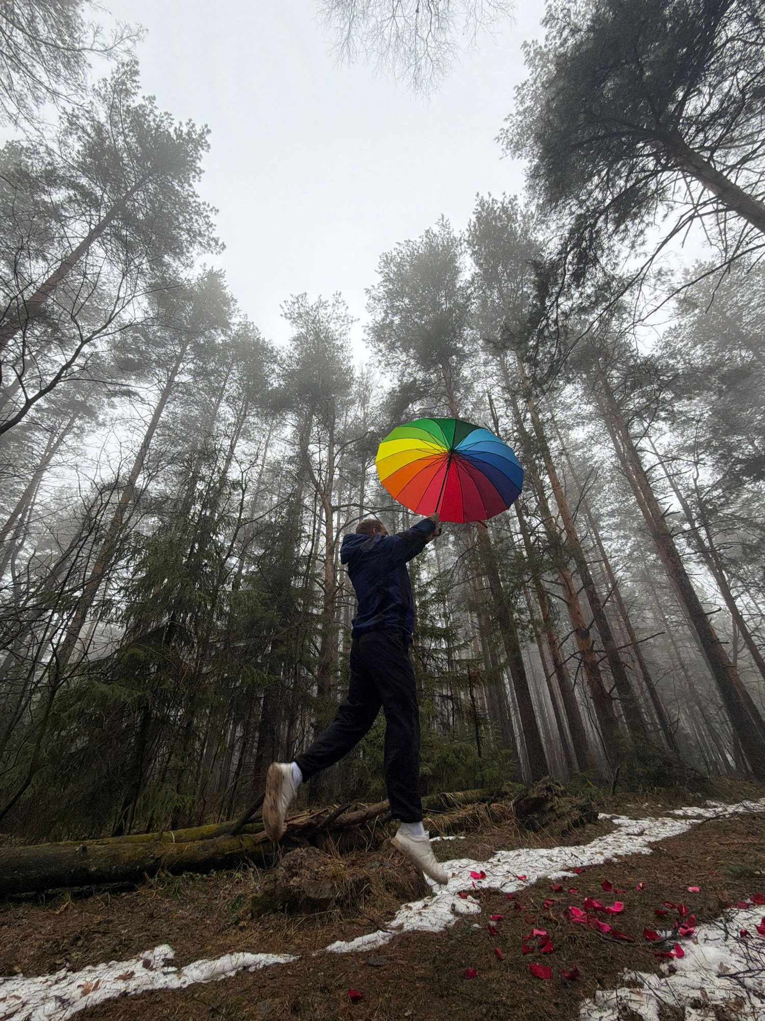 A person is holding a multicolored umbrella in a forest in Прикамский, Russia. The trees are tall and thin, and the ground is covered in a mix of brown earth and snow. There are red flower petals on t…read more