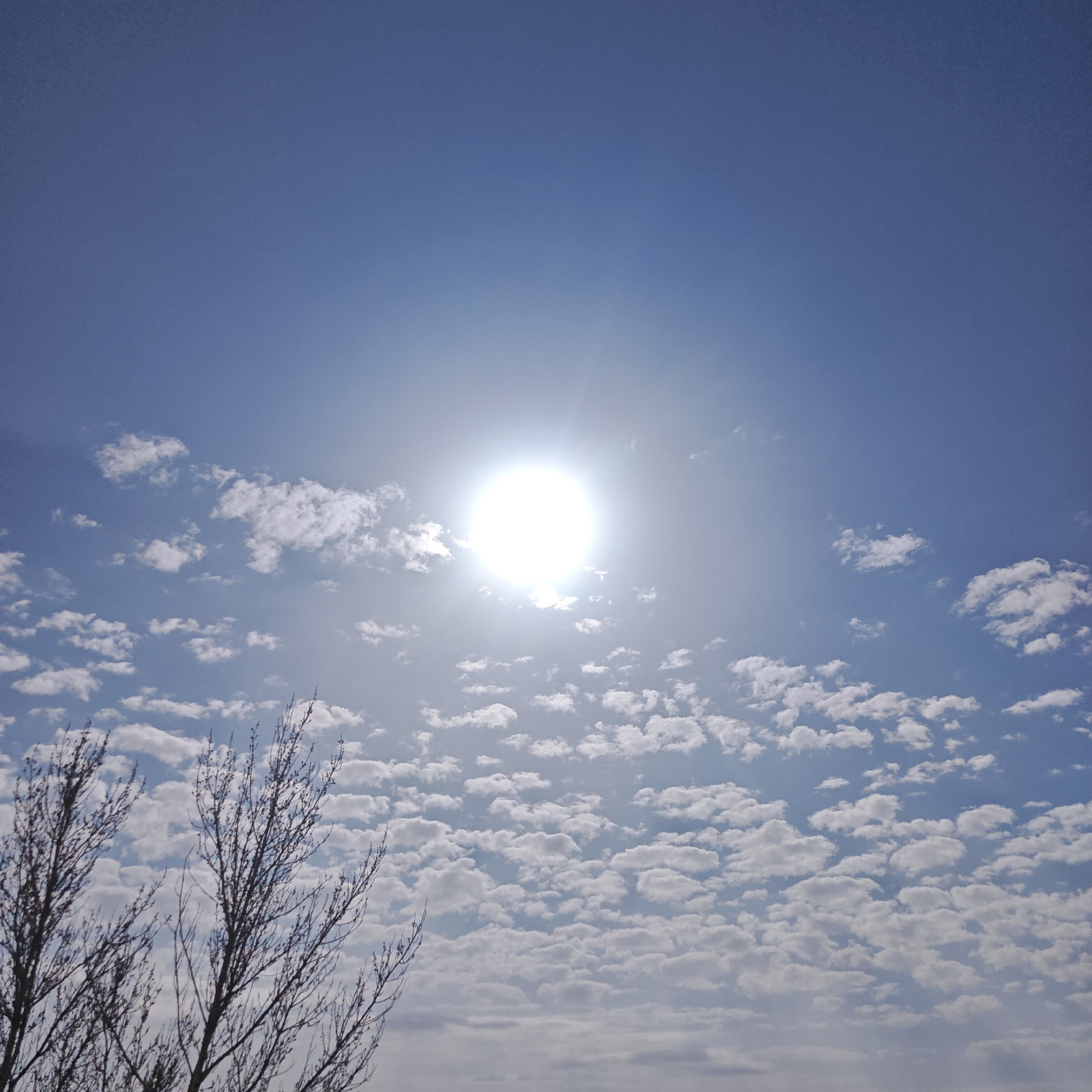 The image shows a bright daytime sky with the sun prominently displayed. Below the upper blue sky, there are layers of small, puffy white clouds. In the bottom left corner, there is a leafless tree br…read more