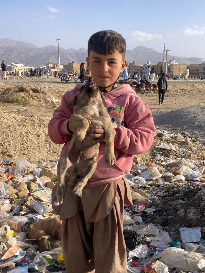 A young boy, approximately 8-12 years old, stands centrally in the foreground of an outdoor scene within Quetta City Tehsil, Pakistan. He is dressed in a pink hooded sweatshirt and brown trousers, hol…read more