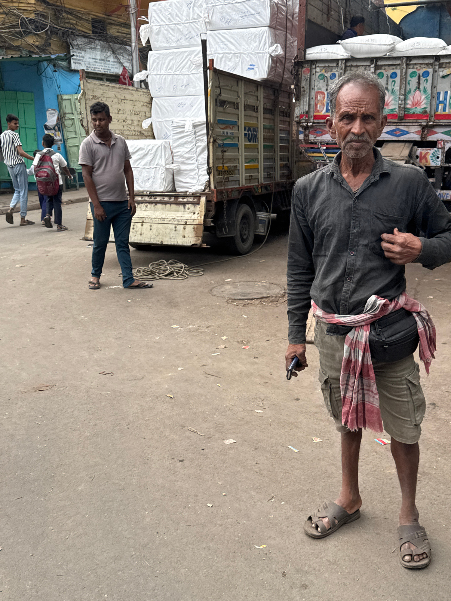 The image captures a scene in Kolkata, India. An elderly man, dressed in a dark shirt, light shorts, and sandals, stands near a truck loaded with bags. He holds a mobile phone. A red and white checkerβ¦read more