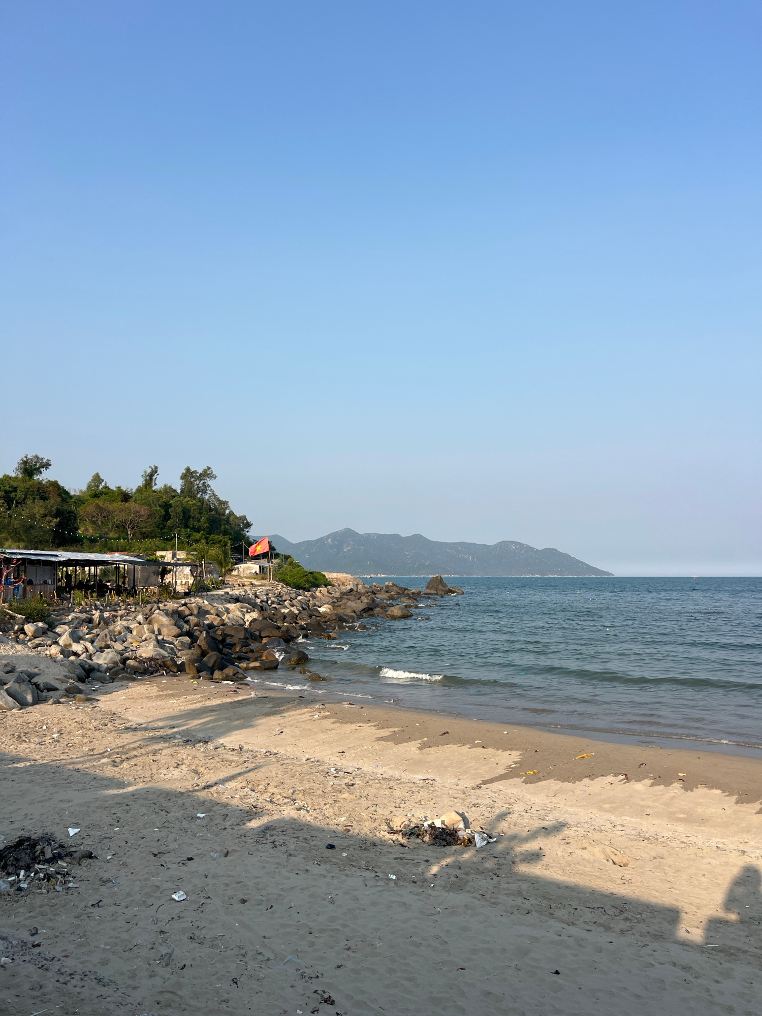 The image captures a coastal scene in Vĩnh Lương, Vietnam. A sandy beach occupies the right portion of the frame, with trash scattered across the sand. The shadow of a person is cast on the beach. To…read more