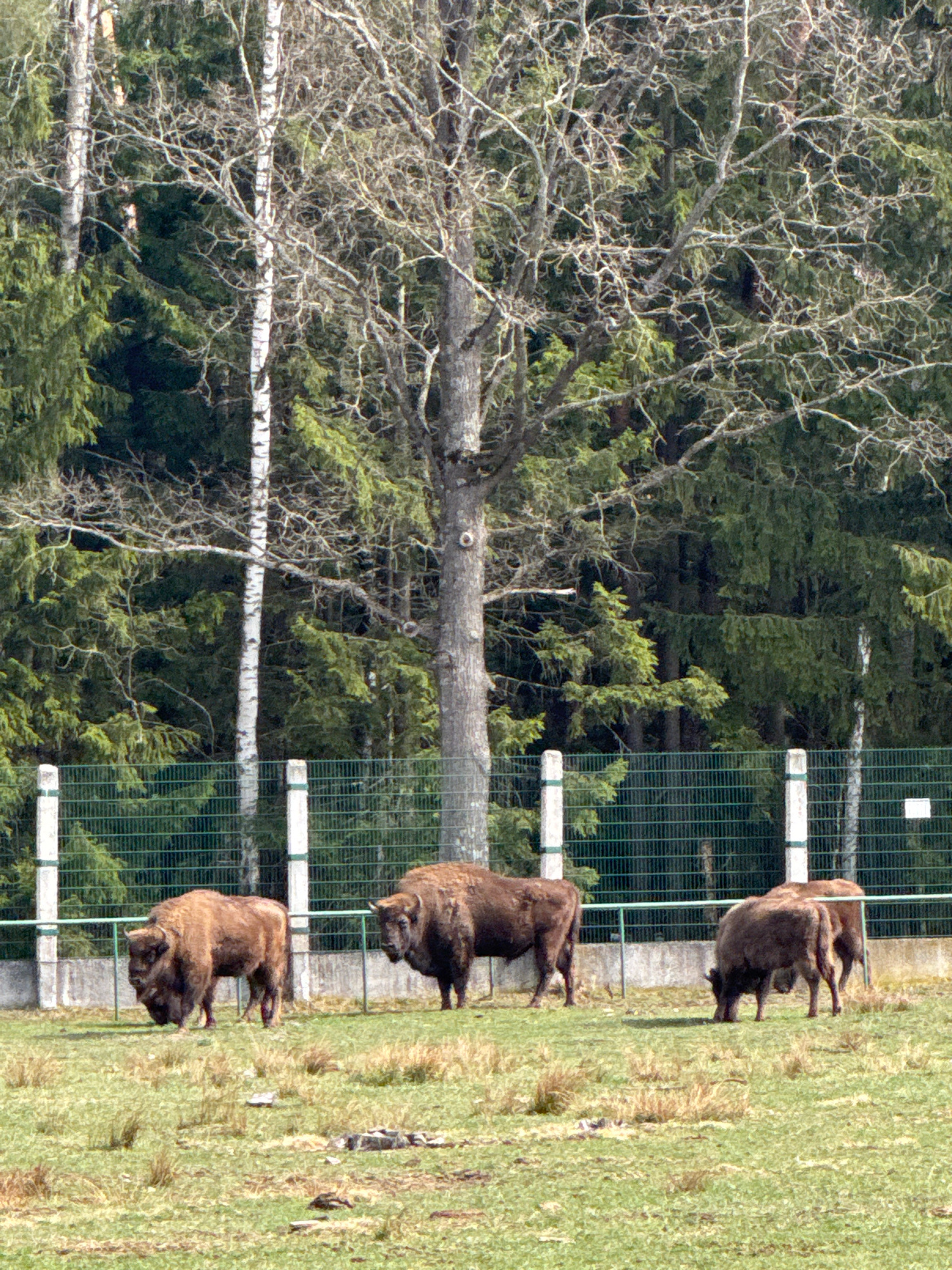 A landscape scene in Камянюцкі сельскі Савет, Belarus depicts a herd of European bison standing on a grassy field, separated from a forested area by a green mesh fence. The bison are brown, with thick…read more