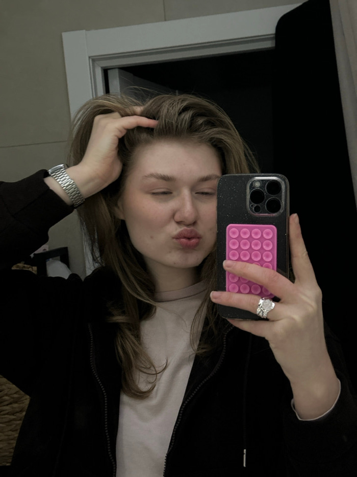 An indoor mirror selfie depicts a single female subject in Kazan, Russia. The subject, with light brown hair, is positioned in the foreground, facing the camera's reflection. She is wearing a black zi…read more