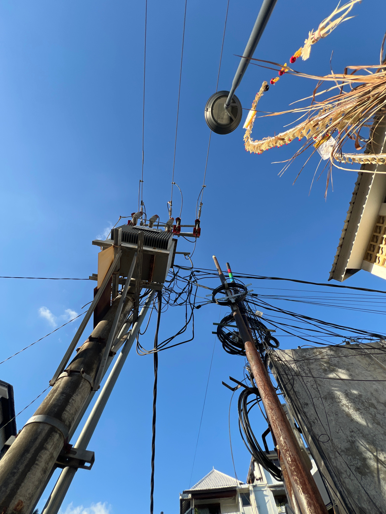 The image, taken from a low angle, shows a dense network of utility poles and wires against a clear blue sky in North Kuta, Indonesia. The poles are primarily concrete and metal, with one appearing ol…read more